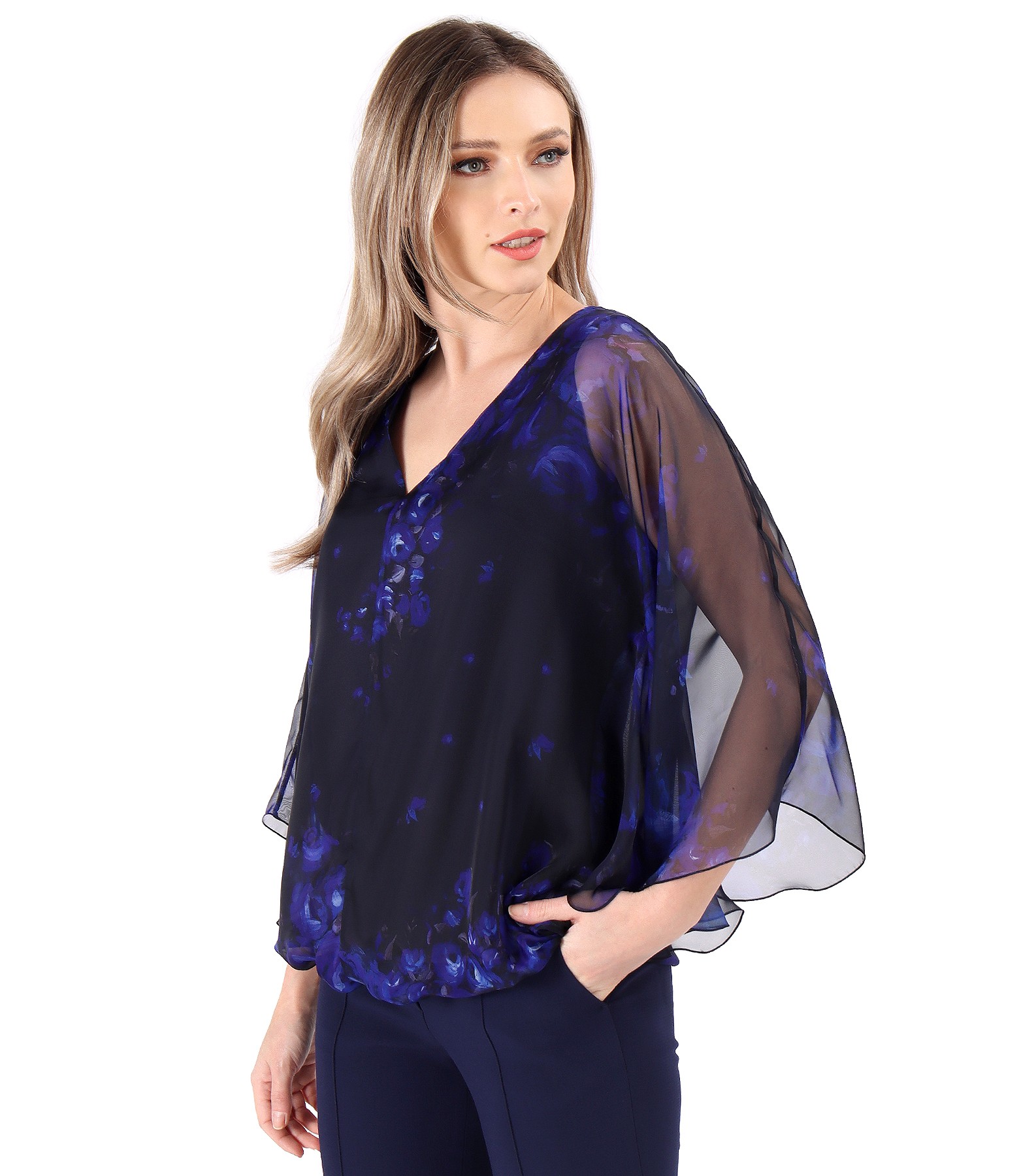 Butterfly blouse made of veil printed with floral motifs, doubled with viscose elastic jersey and V decolletage.