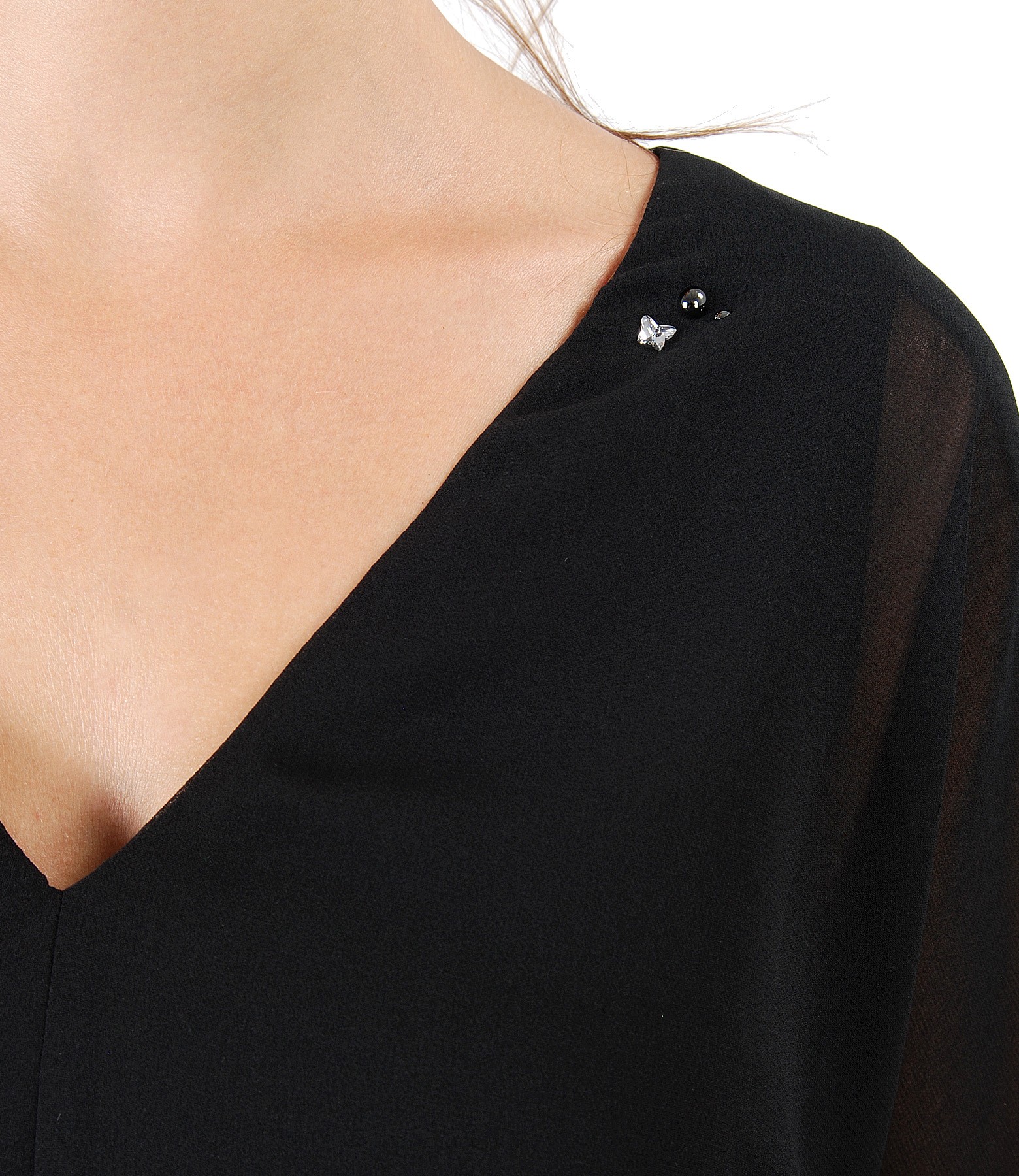 Butterfly blouse, made of veil, with V low-cut neck, doubled with elastic jersey, embellished with crystals on the decolletage.