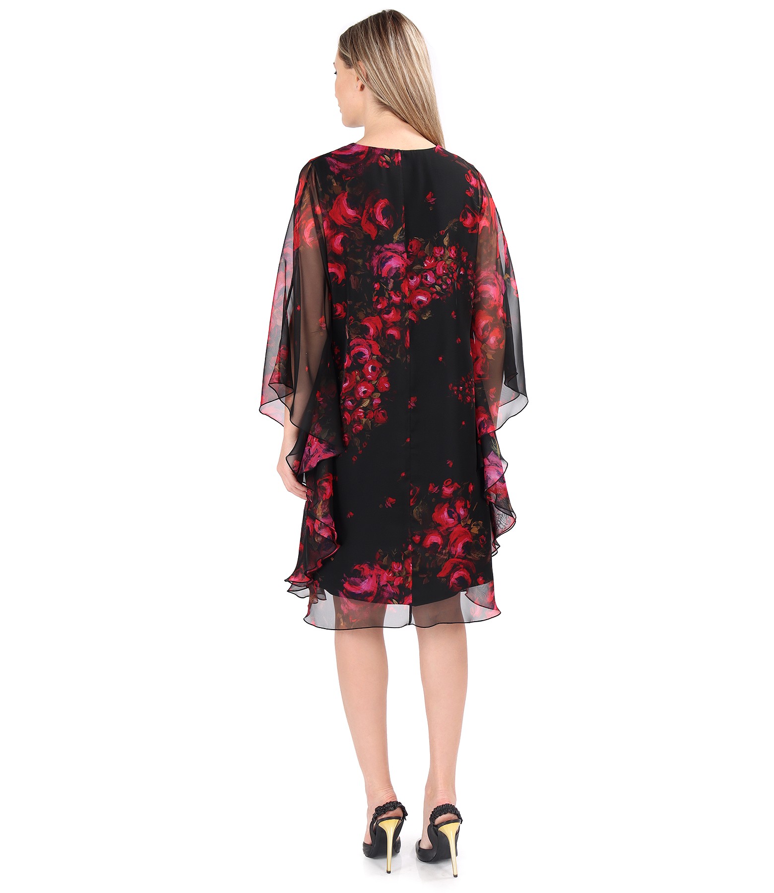 Butterfly dress made of digital printed veil with floral motifs, doubled with viscose and V-neckline.
