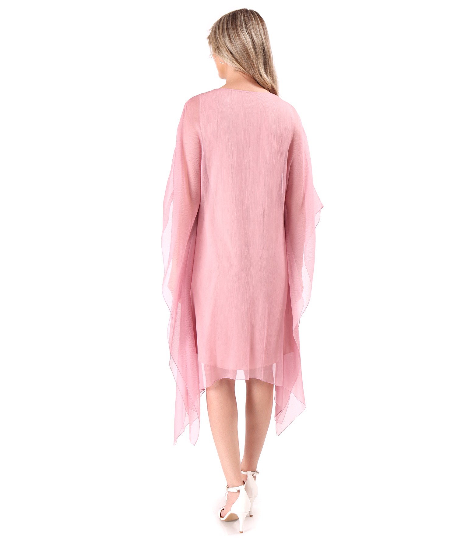 Butterfly dress made of natural silk voile, padded with satine, sleeveless, and round neckline. It has no closure system.