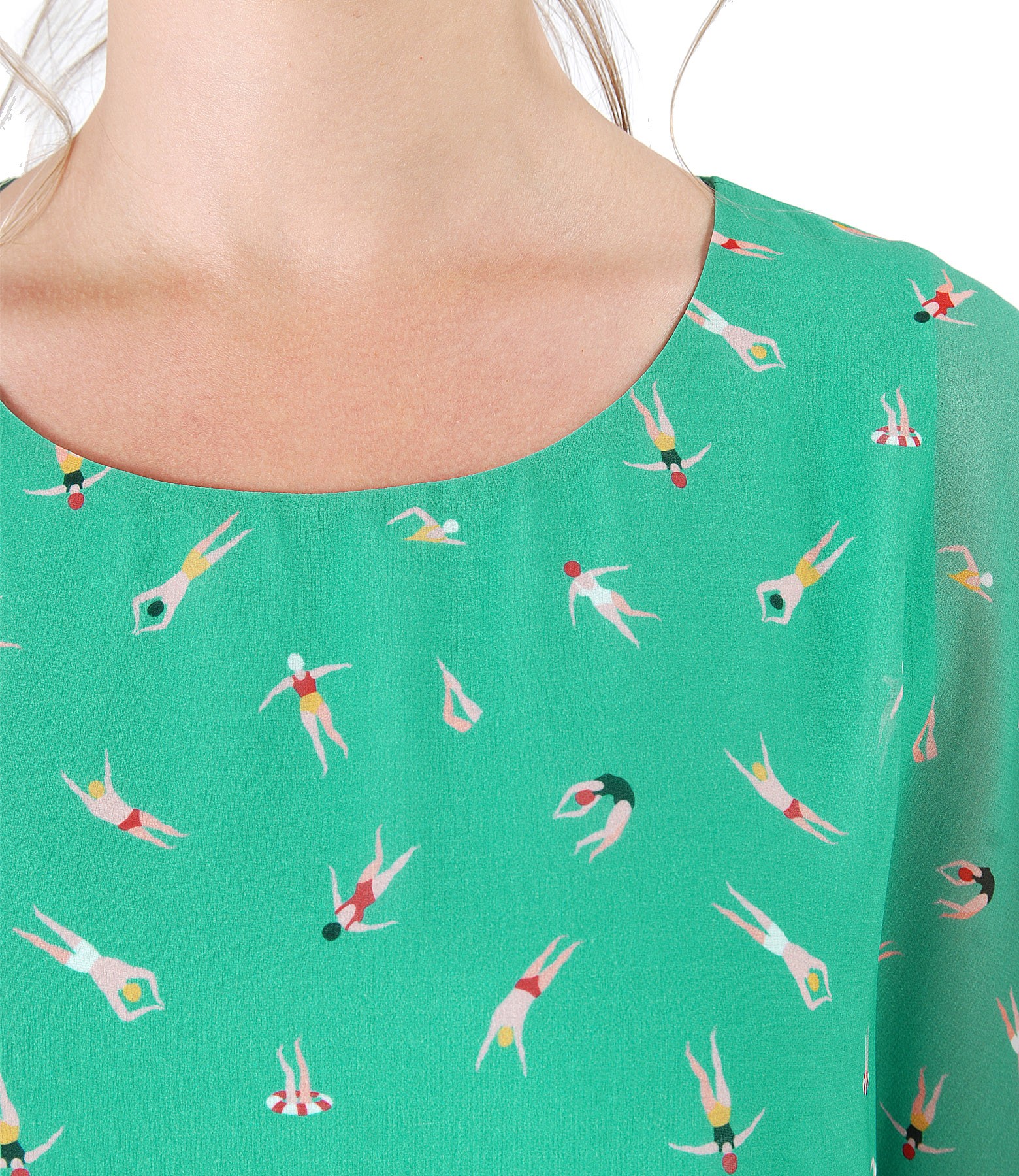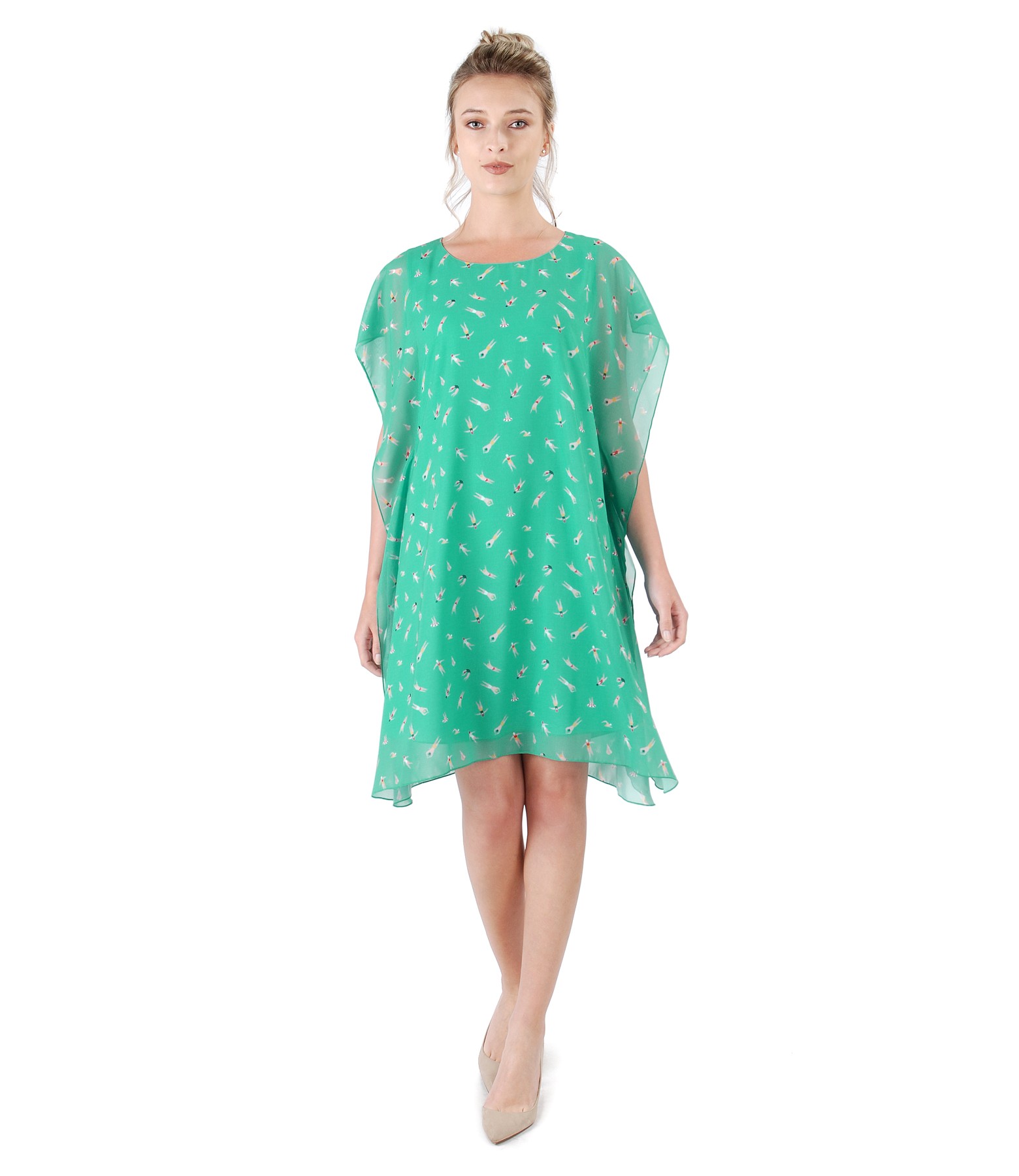 Butterfly dress made of printed veil, doubled with viscose, without sleeves, with round low-cut neck. Have no closing system.