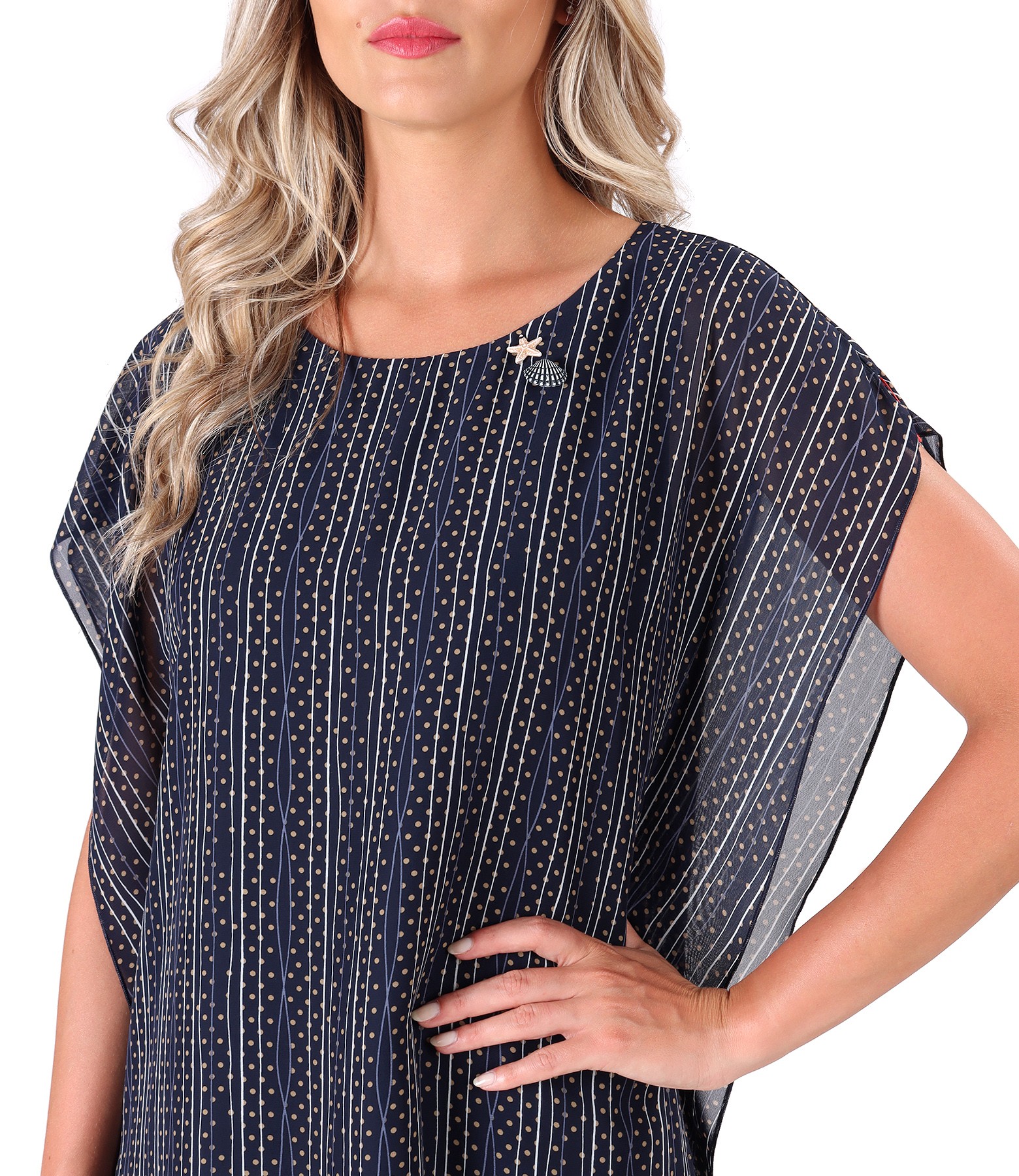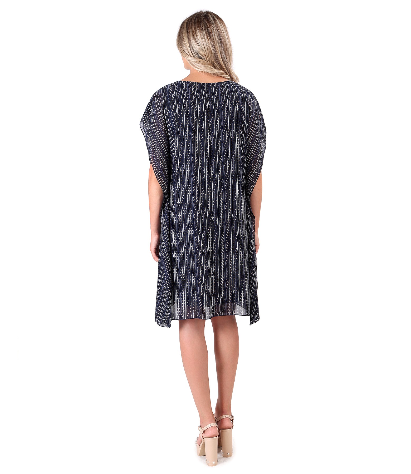 Butterfly dress made of printed veil with geometric motifs,doubled with viscose.without slevees and round decolletage.It has no closing system.