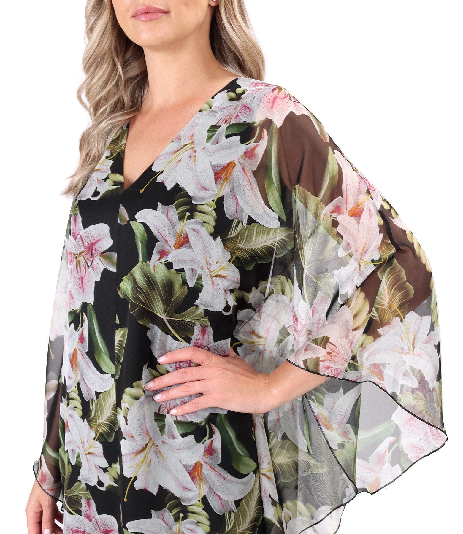 Butterfly dress made of printed veil with floral motifs (Black), size