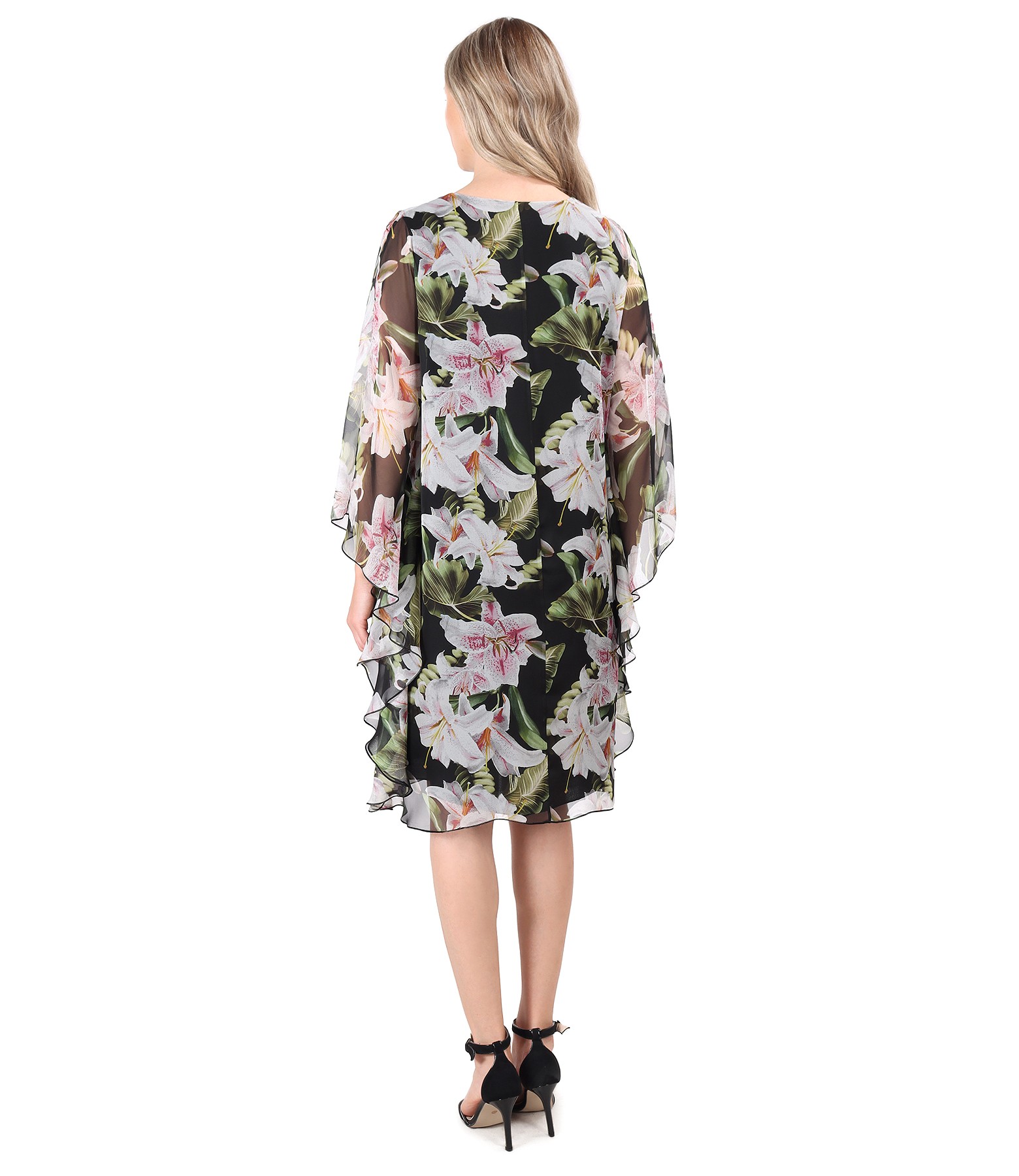 Butterfly dress made of veil printed with floral motifs, doubled with viscose and V-neckline.