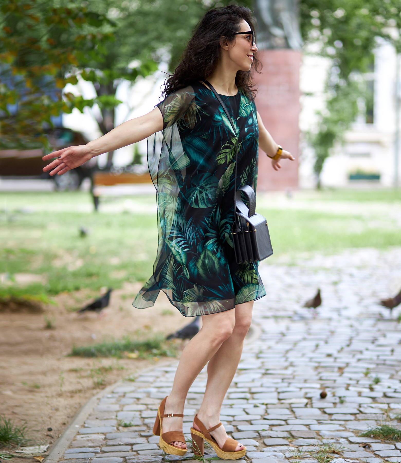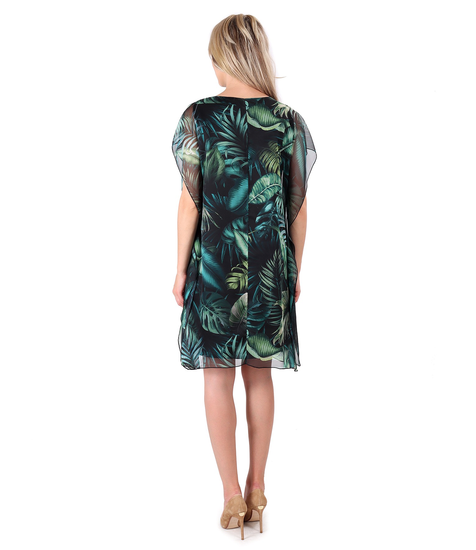 Butterfly dress made of printed veil with floral motifs, doubled with viscose, without sleeves and round decolletage. Without closing system.