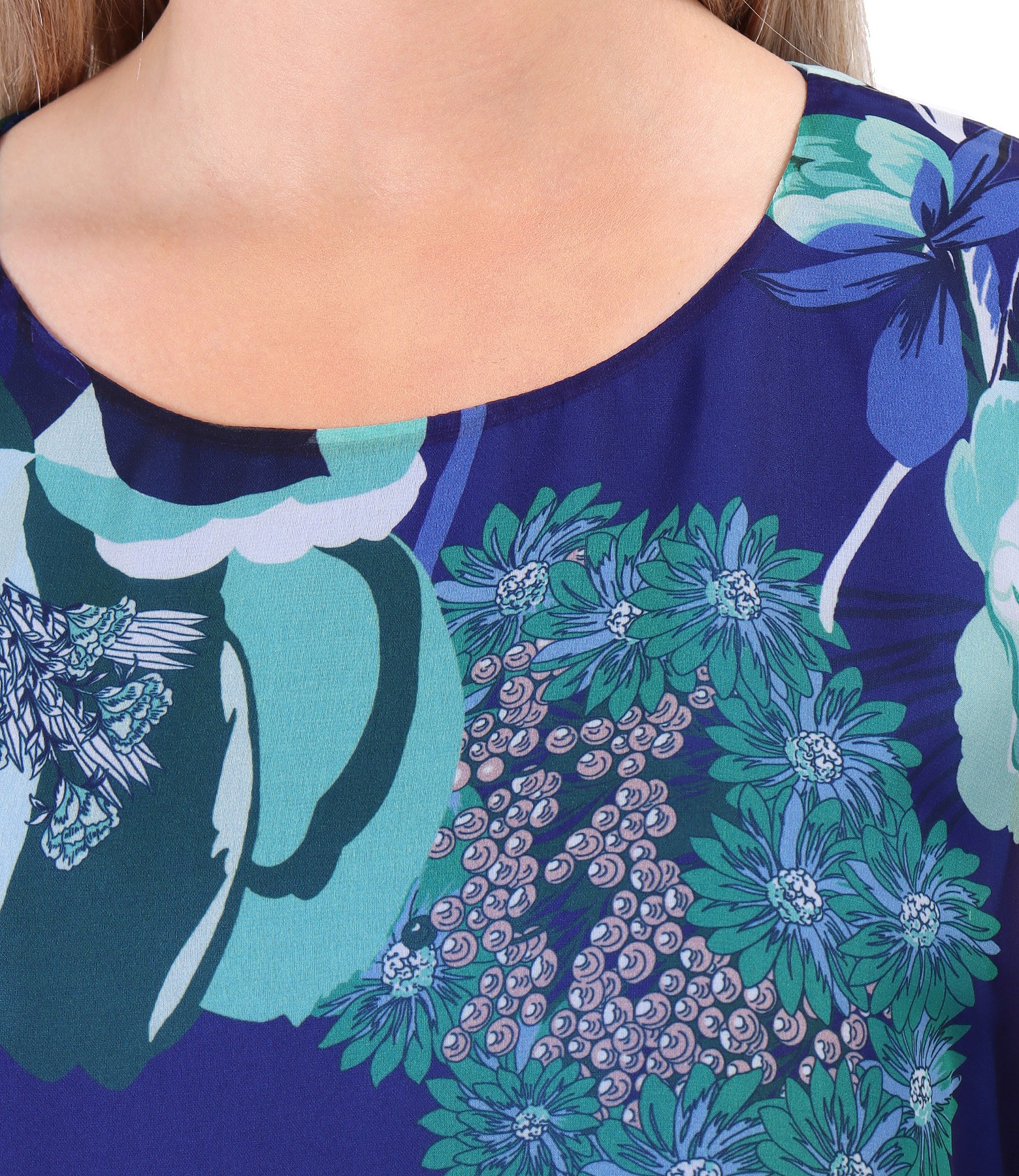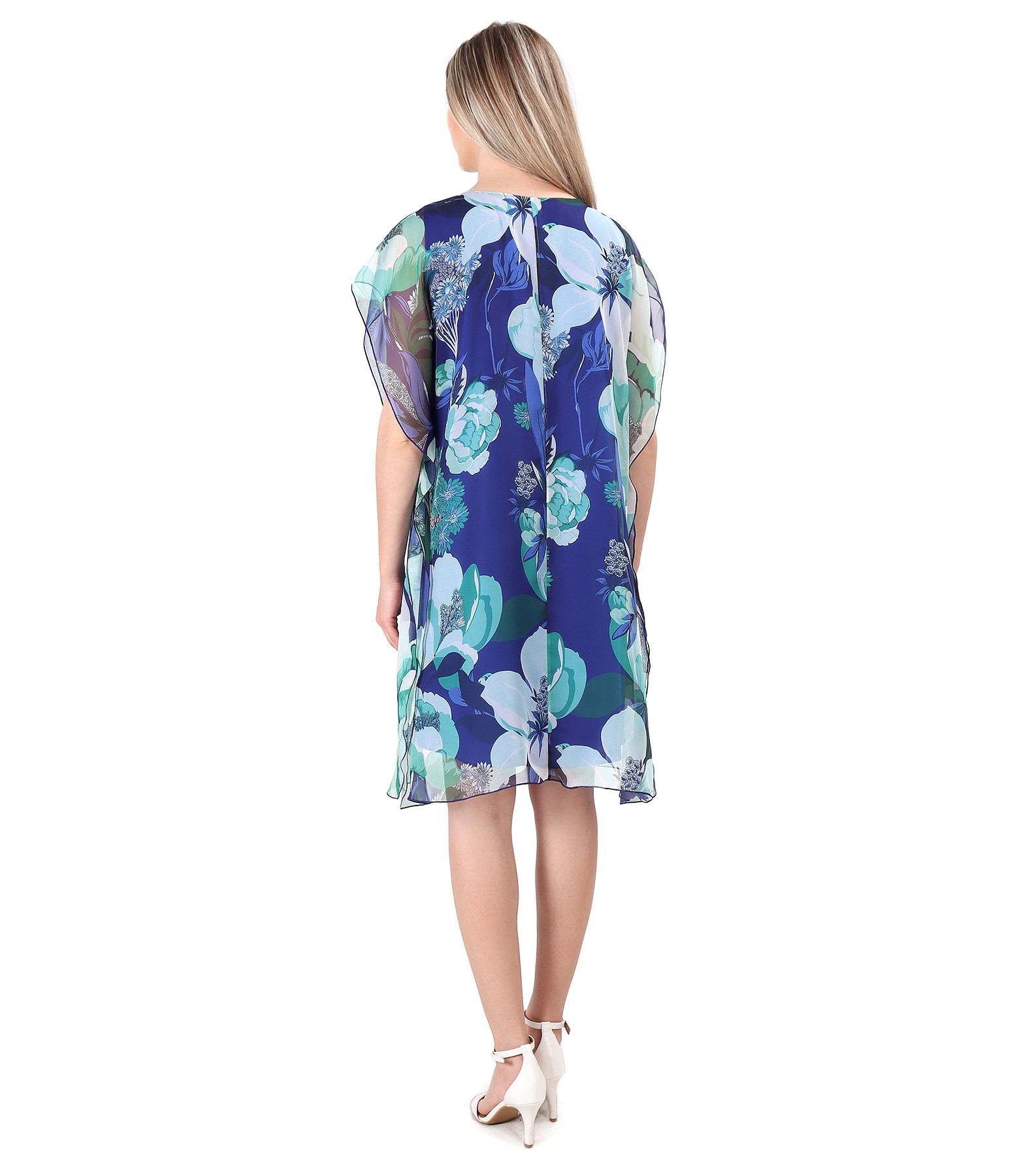 Butterfly dress made of printed veil with floral motifs, doubled with viscose, without sleeves and round decolletage. Without closing system. Print position varies per product.