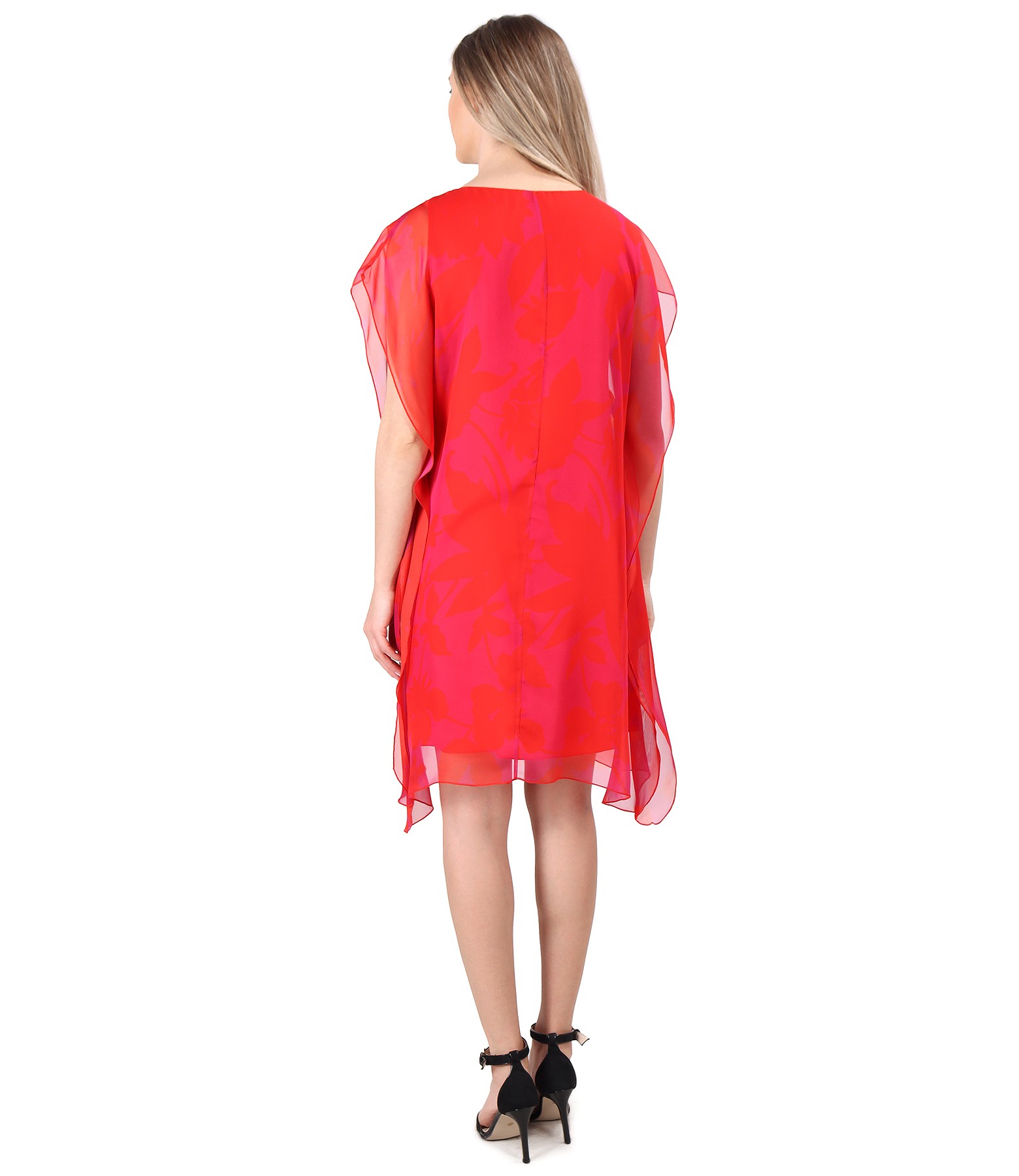 Butterfly dress made of printed veil with floral motifs, doubled with viscose, without sleeves and round decolletage. Without closing system.