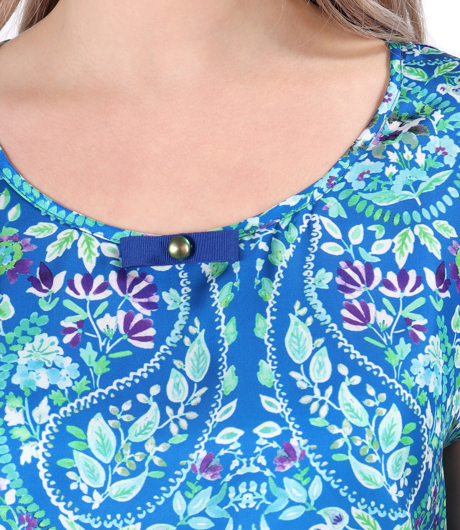 Casual blouse made of satin printed with floral motifs, with dropped shoulders, elastic at the waist, bow and crystals at the decolletage.