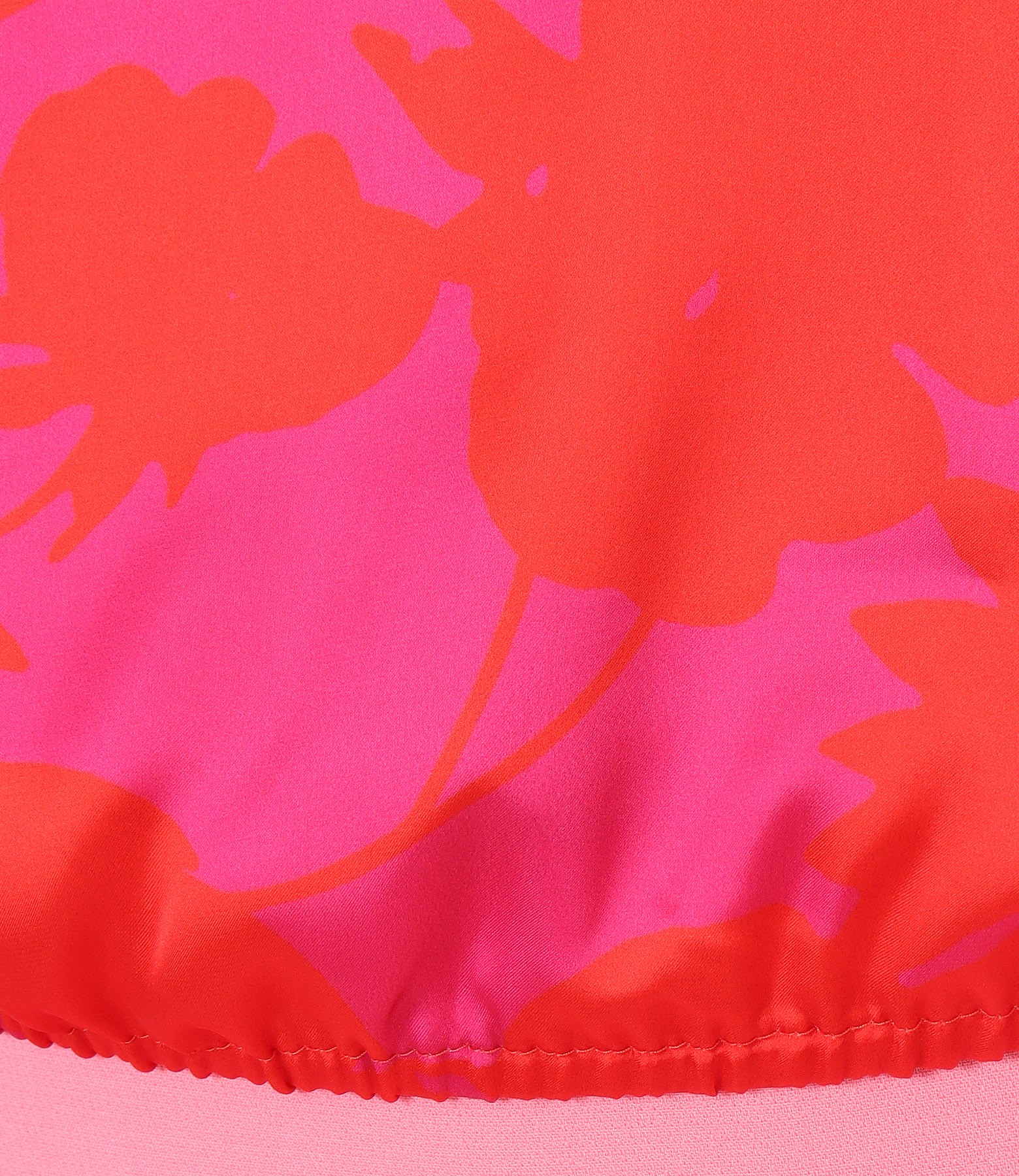 Casual blouse made of satin printed with floral motifs, with dropped shoulders, elastic at the waist, bow and crystals at the decolletage.