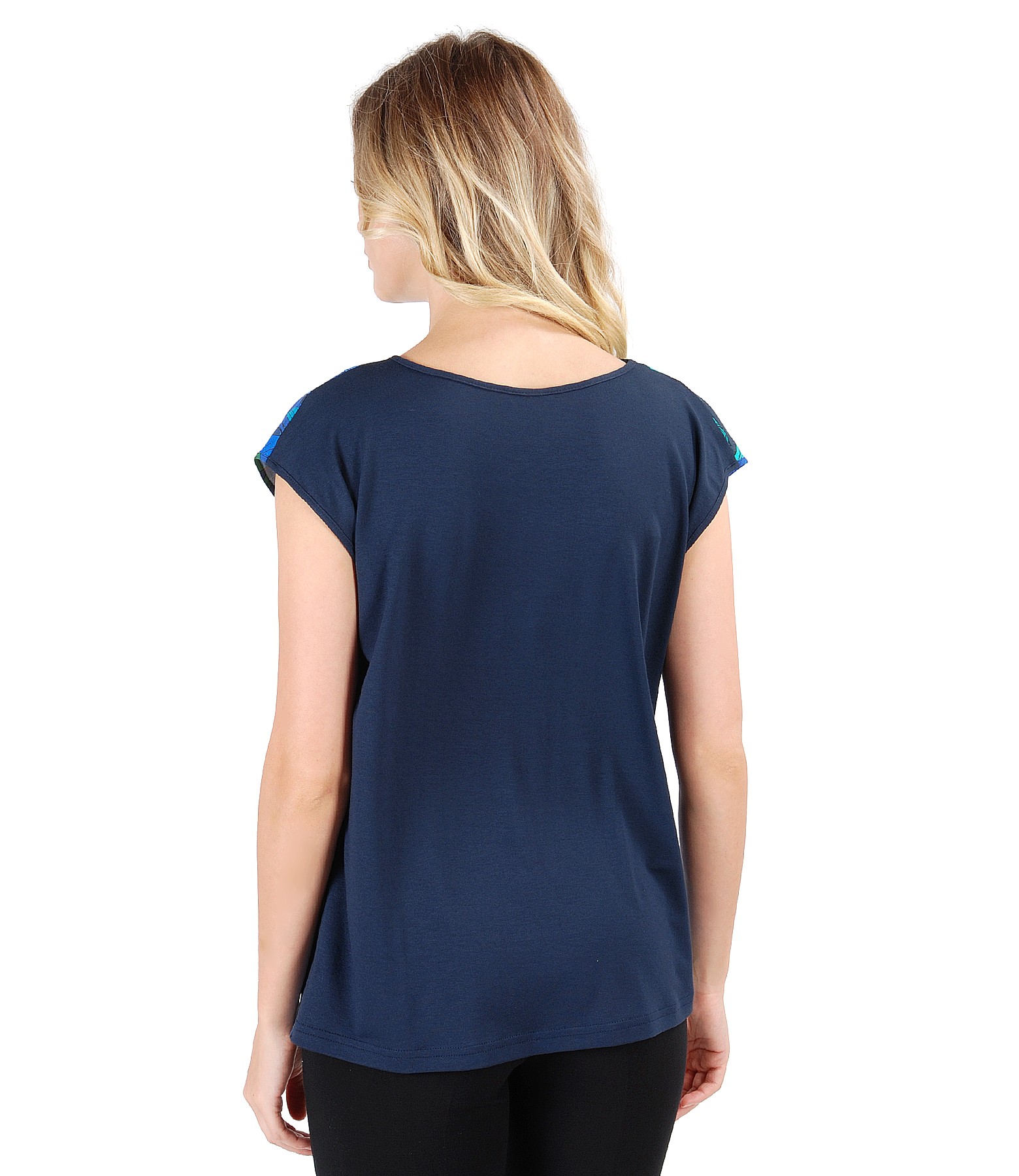 Casual blouse, with viscose front and floral print, uni elastic jersey back, draped sleeves and V low-cut neck.
