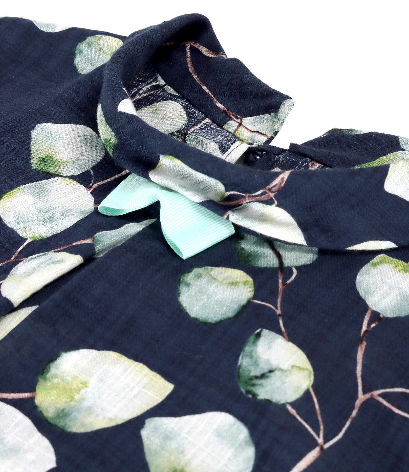 Casual cotton blouse with viscose printed with floral motifs, 3/4 sleeves wrinkled at the end, with a fold in the middle of the front and a bow at the neckline. It closes with a button on the middle back.