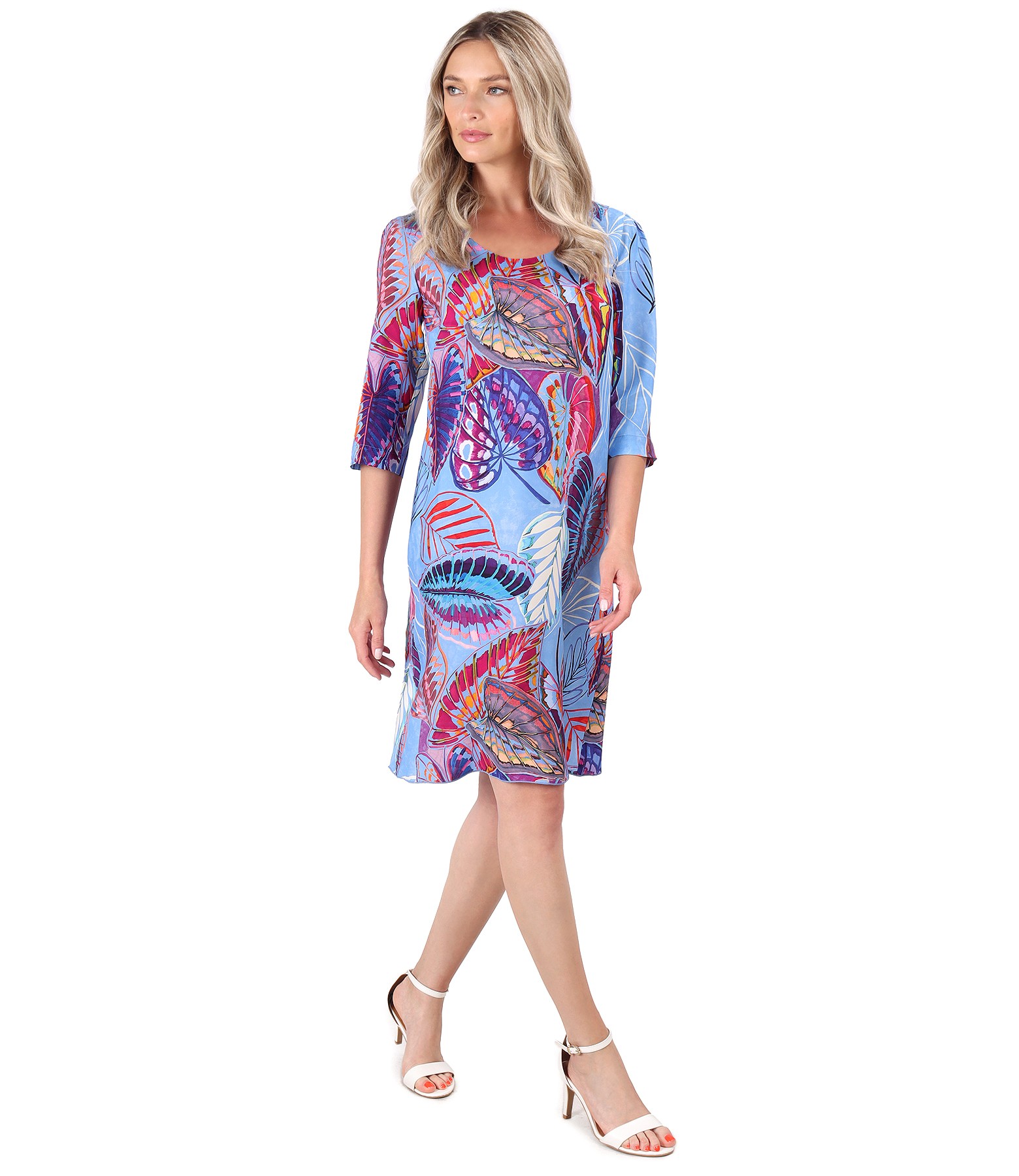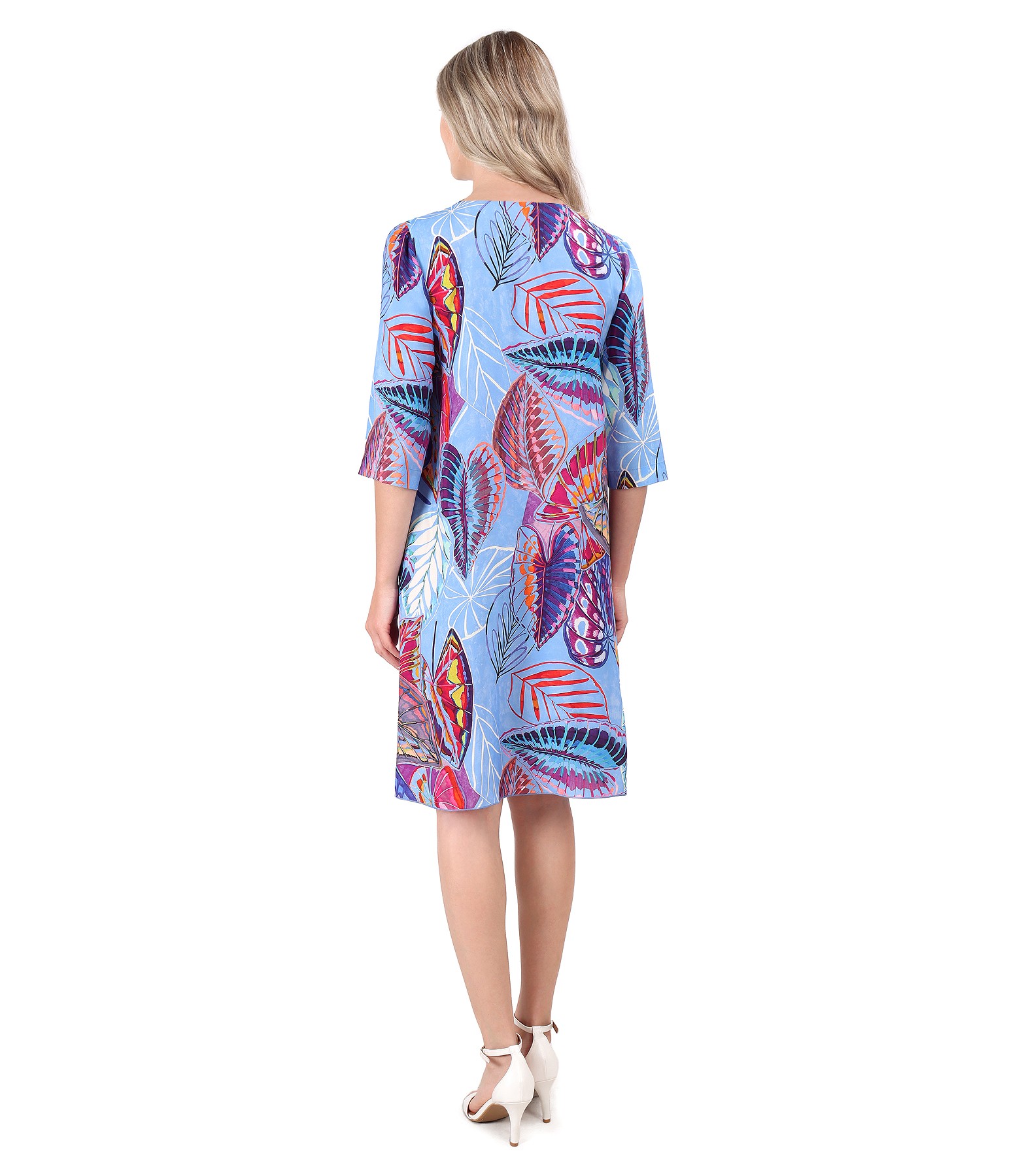 Casual dress in natural cupro fabric with digital print with oversized leaves, doubled with viscose, with round neckline and 3/4 sleeves.