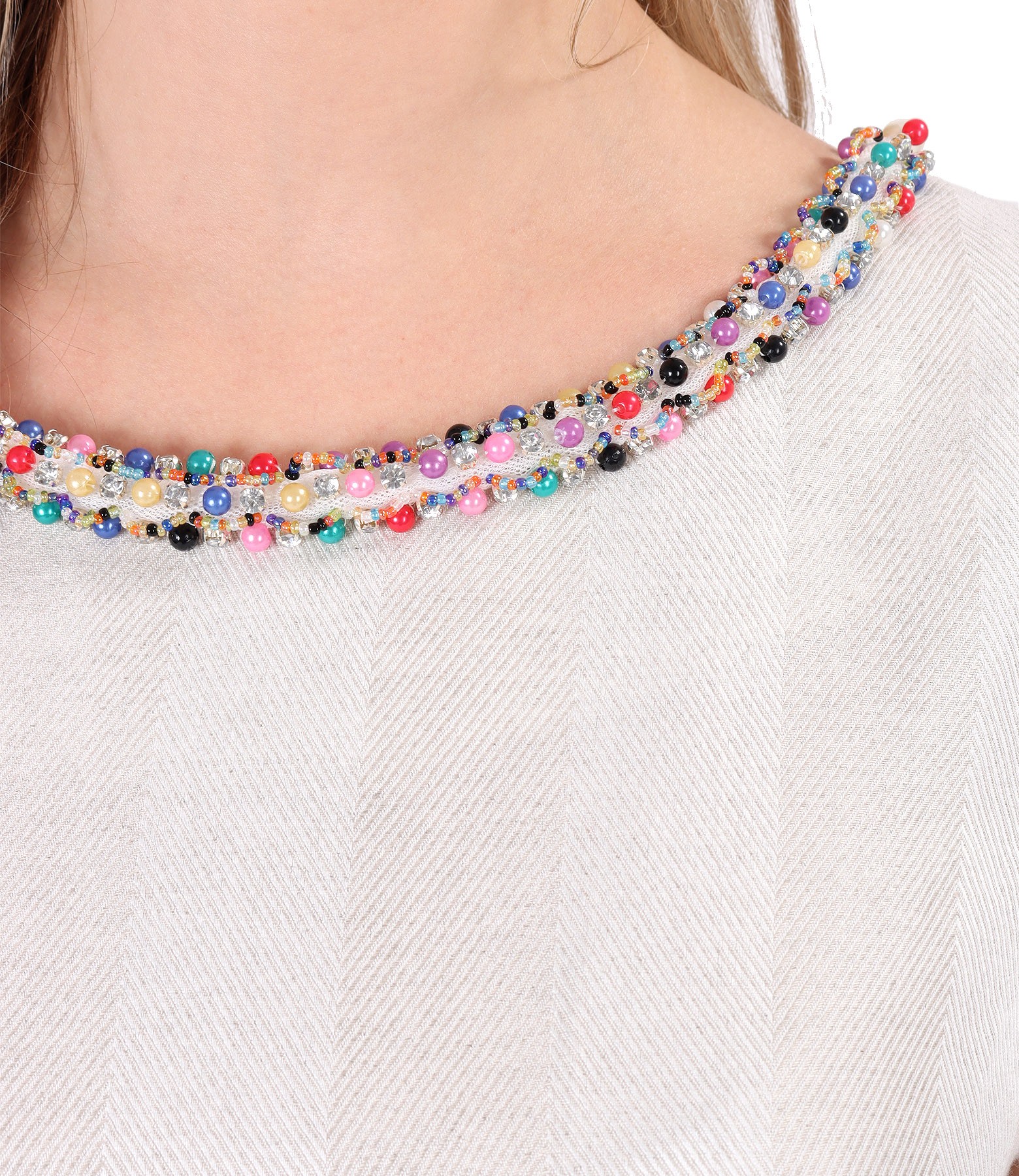 Straight dress made of linen and viscose,with short sleeves and decorative flaps at the waist.With round decolletage accessorized with colorful trimmings.It closes with zipper hidden on the middle back.