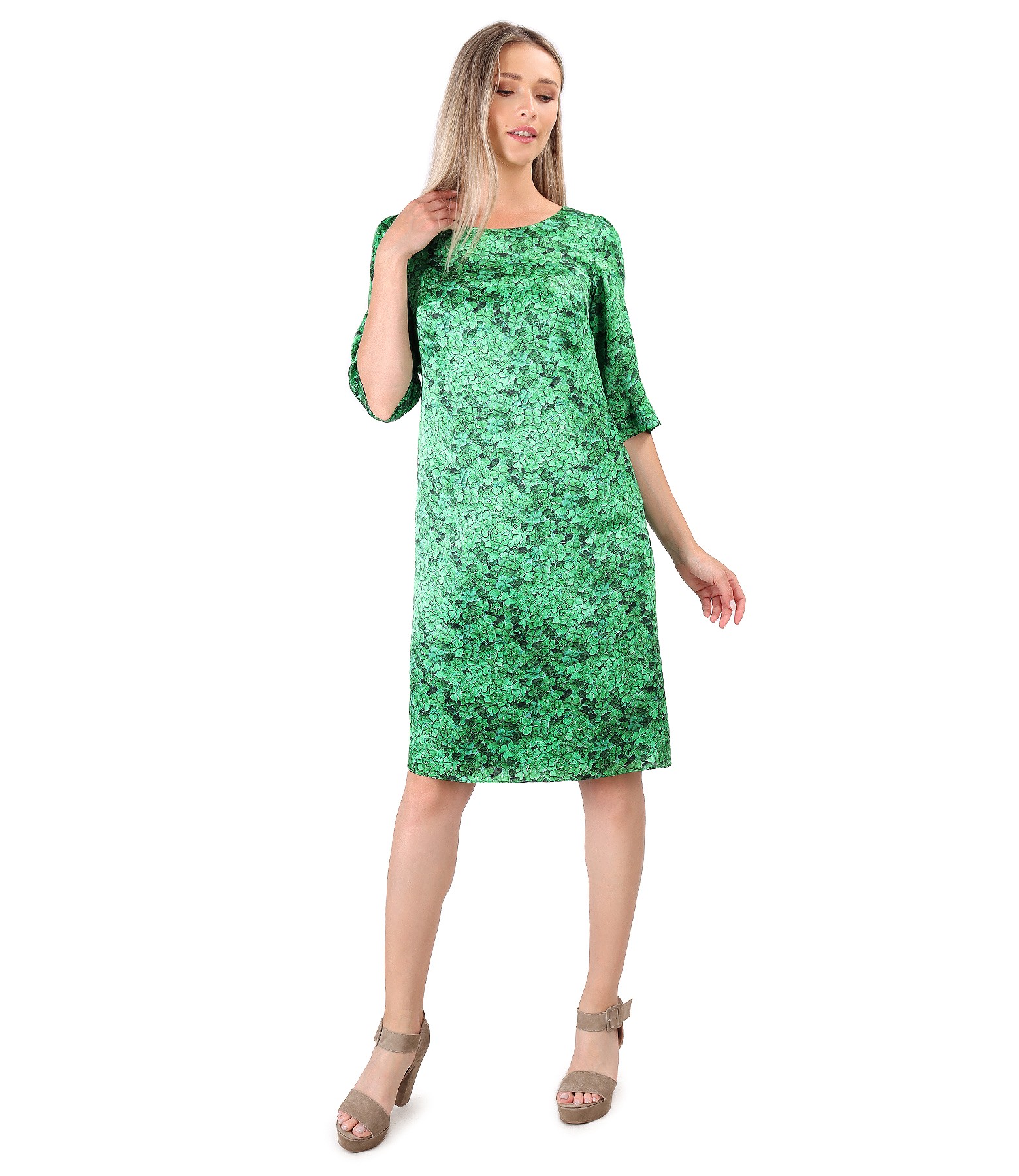 Casual dress made of natural silk, digitally printed with floral motifs. The dress is padded with viscose, has 3/4 sleeves and a round neckline. It closes with a hidden zipper on the middle back.