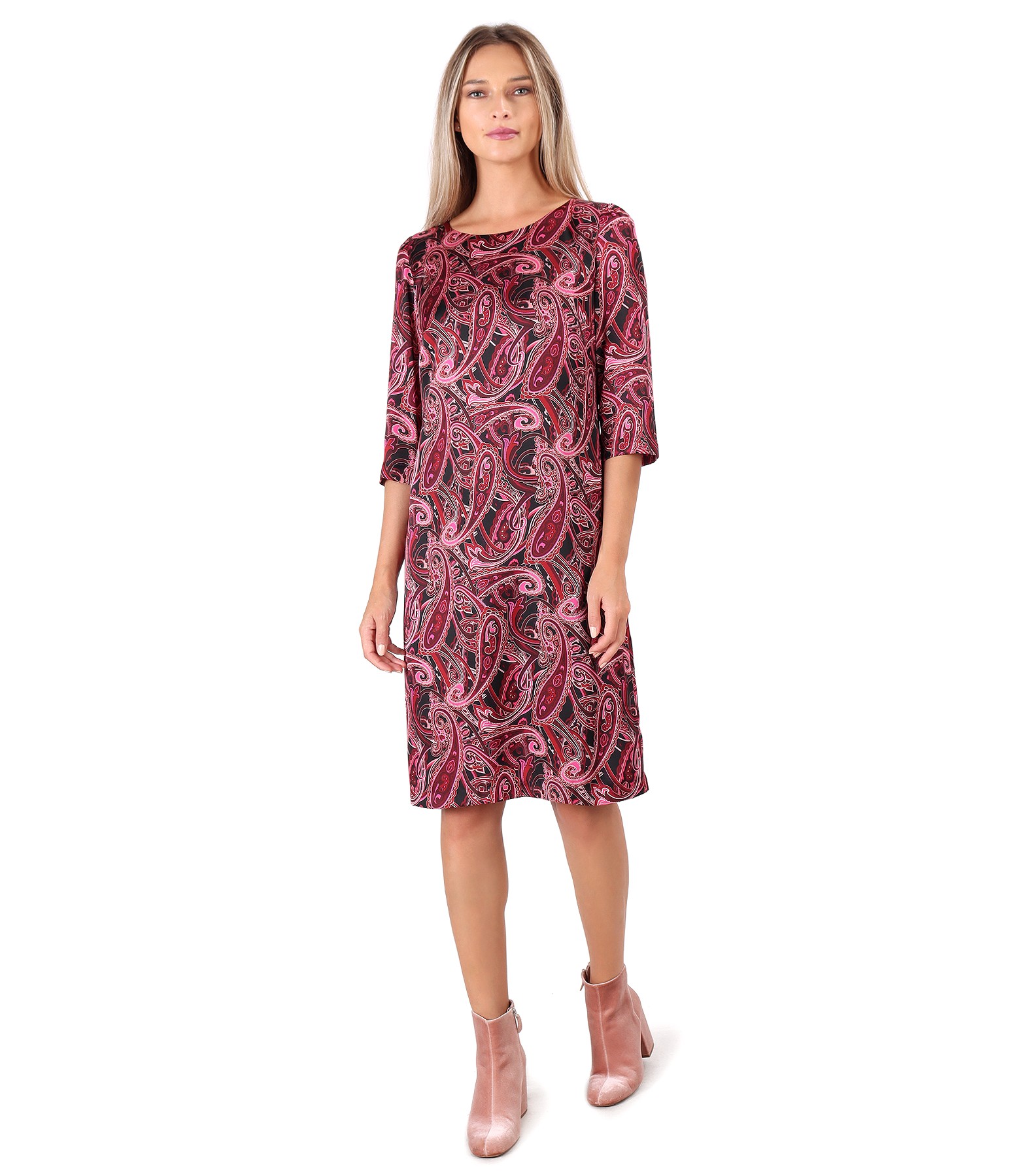Casual dress made of paisley printed satin, doubled with viscose, with 3/4 sleeves and round neckline. Closes with a zipper hidden in the middle of the back.