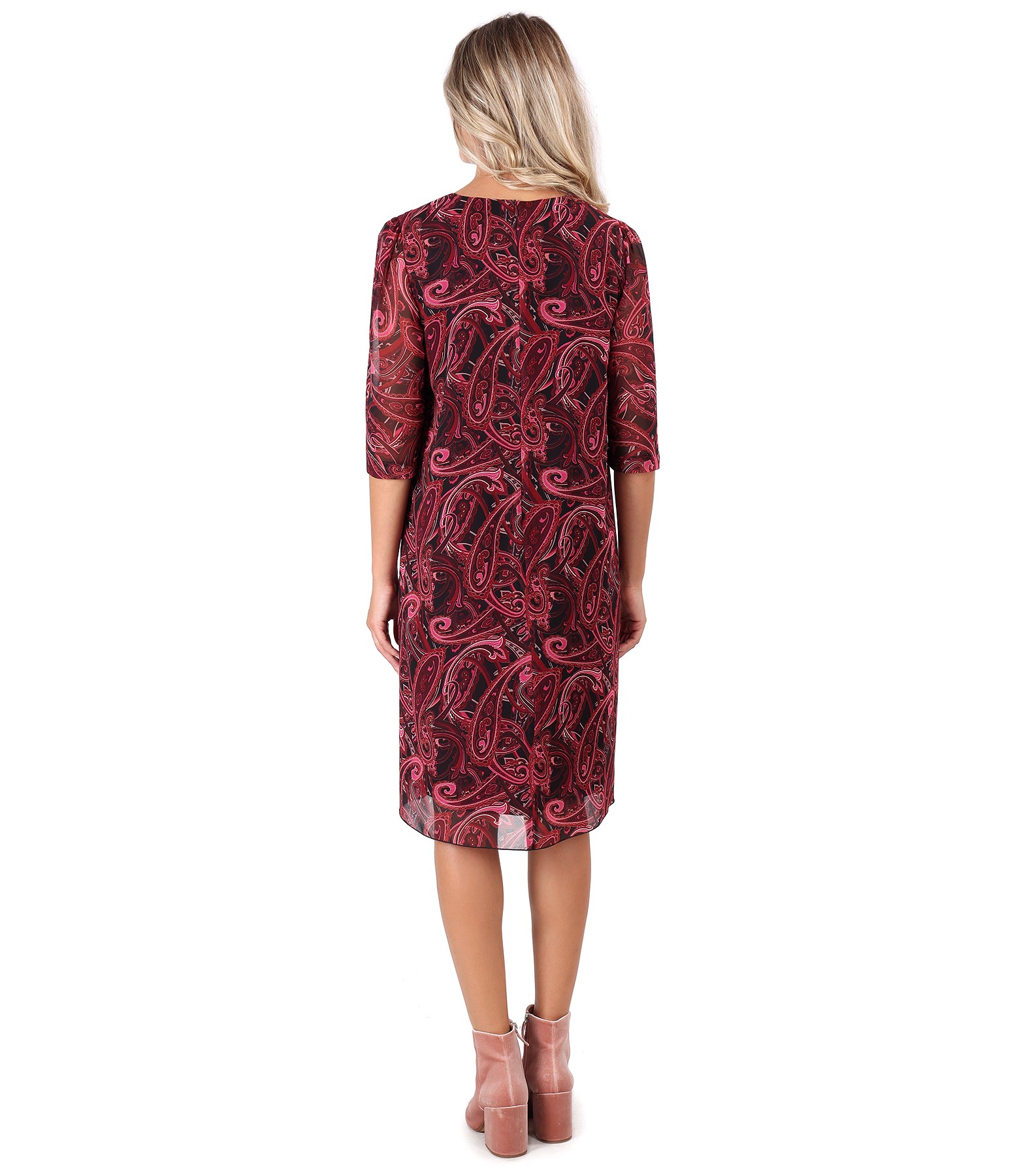 Casual dress made of paisley printed veil, doubled with viscose, with round neckline and 3/4 sleeves. Closes with a zipper hidden in the middle of the back.