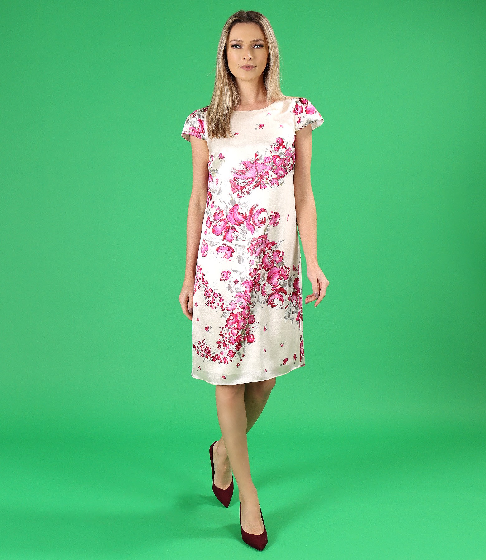 Casual natural silk dress, digitally printed. The dress is padded with viscose, has short sleeves and a round neckline. It closes with a hidden zipper on the middle back.