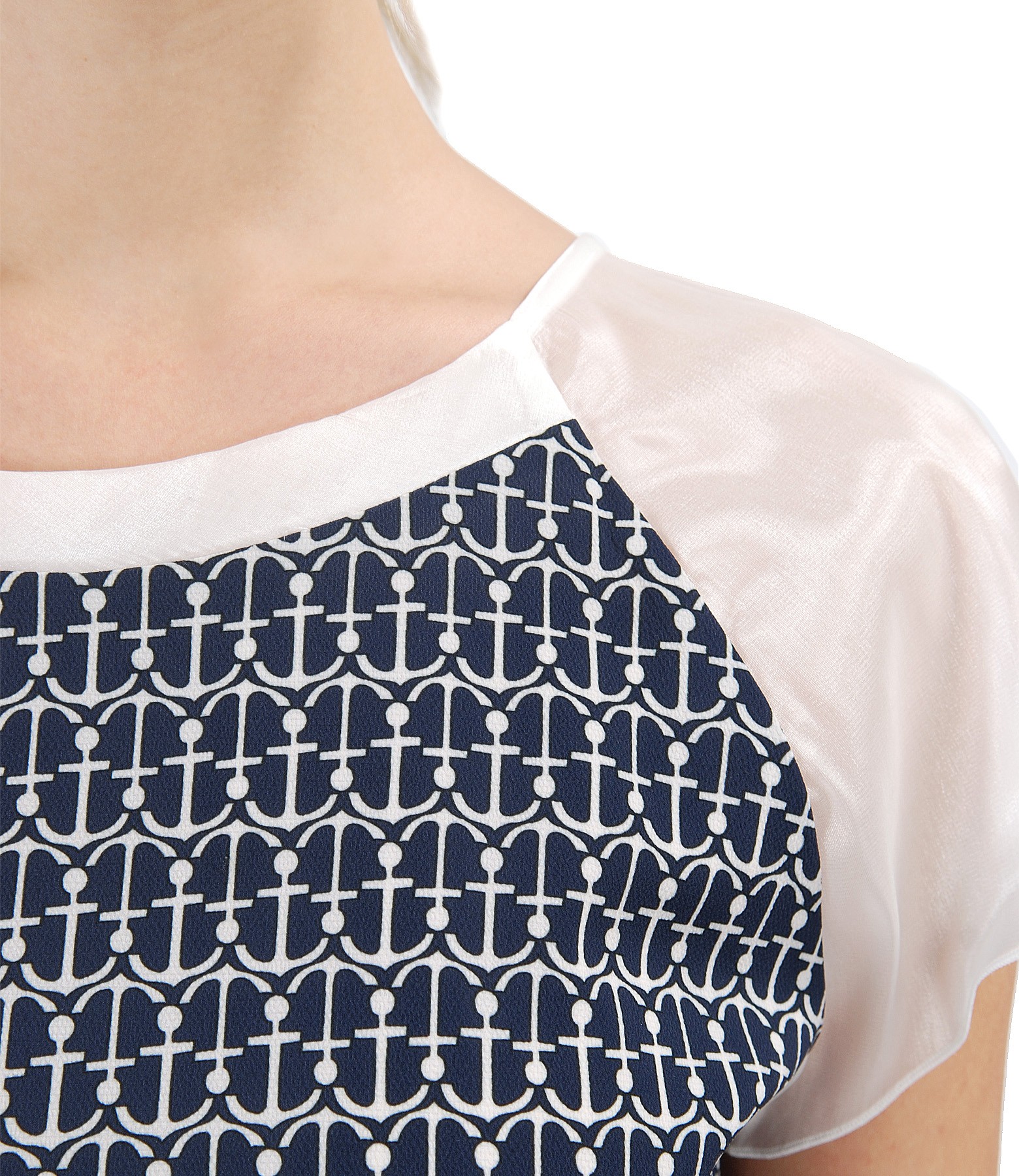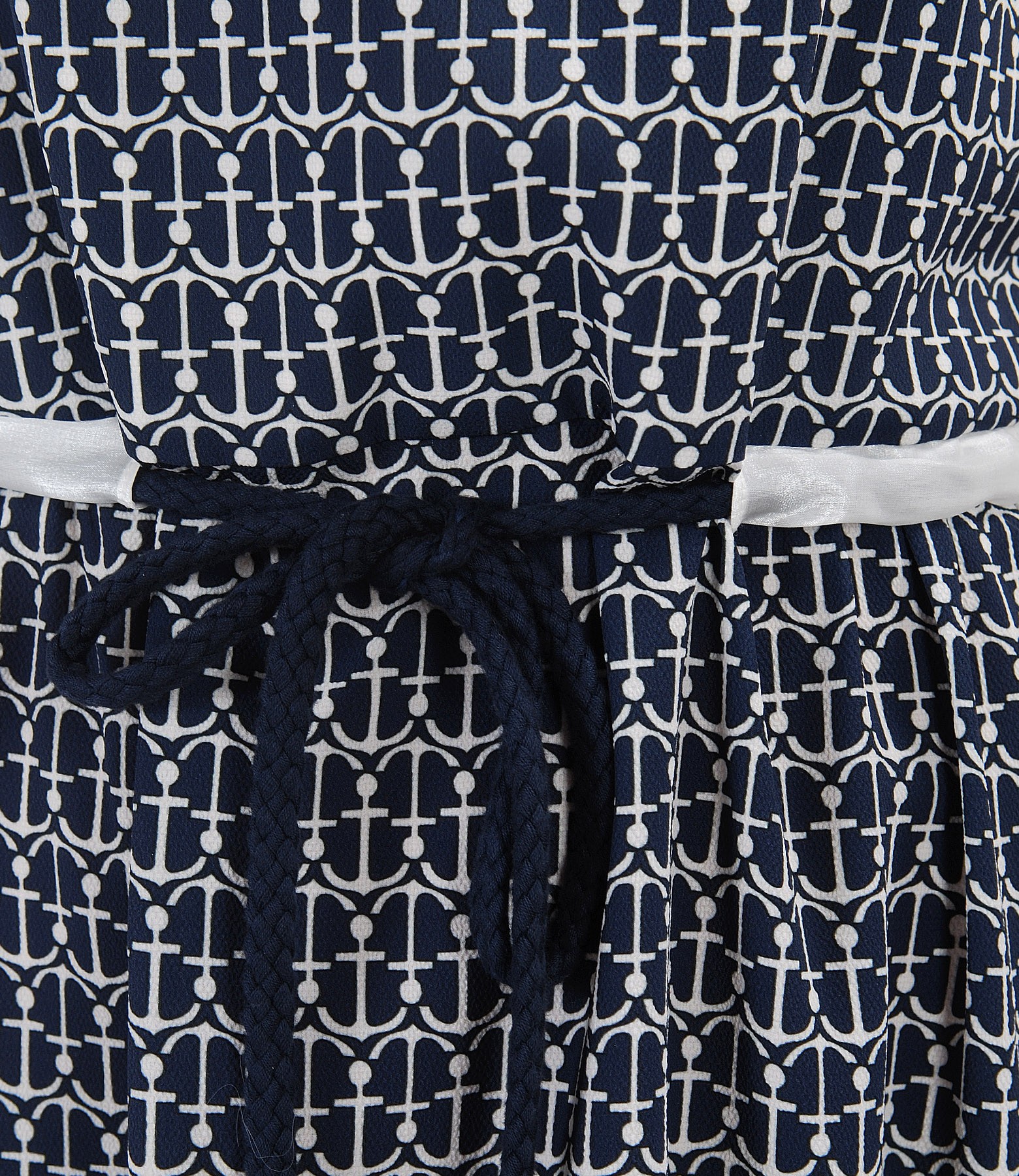 Casual dress, inlay, with round low-cut neck, organza short sleeves and waist cord.