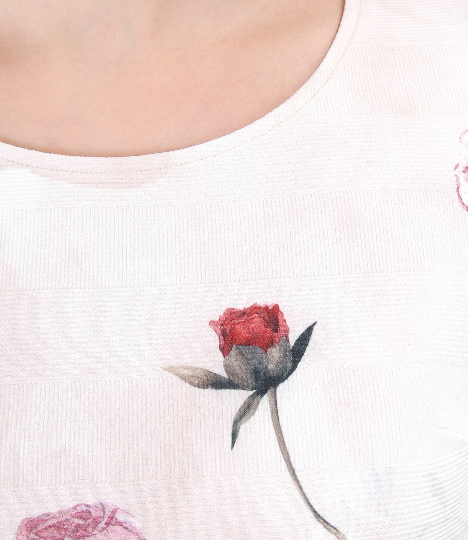 Casual dress with front printed with flower motifs, short sleeves and round low-cut neck. Have no closing system.
