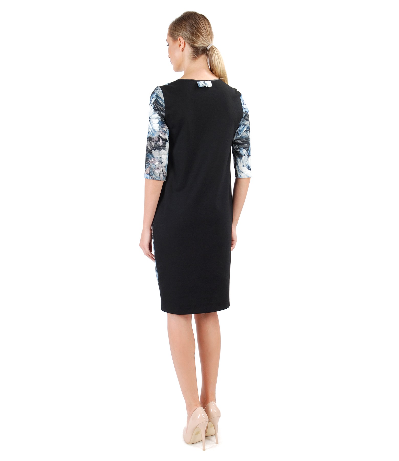 Casual dress, with front made of elastic fabric with metallic silver wire, with digital floral print, round low-cut neck, 3/4 sleeves and with a back bow. Closes with a button on the middle back.