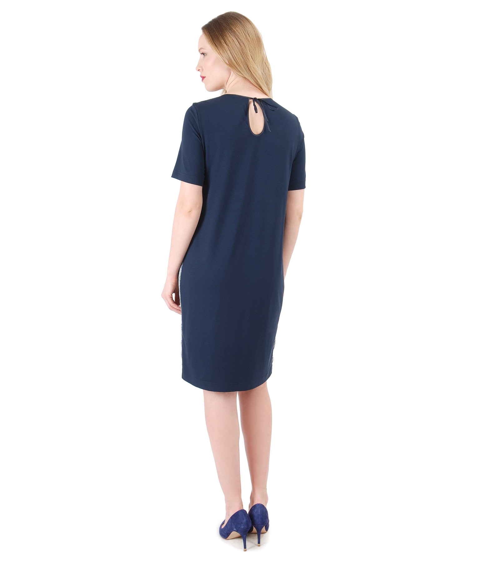 Casual dress with front made of black and white printed viscose, with short sleeves and round decolletage. Have no closing system.