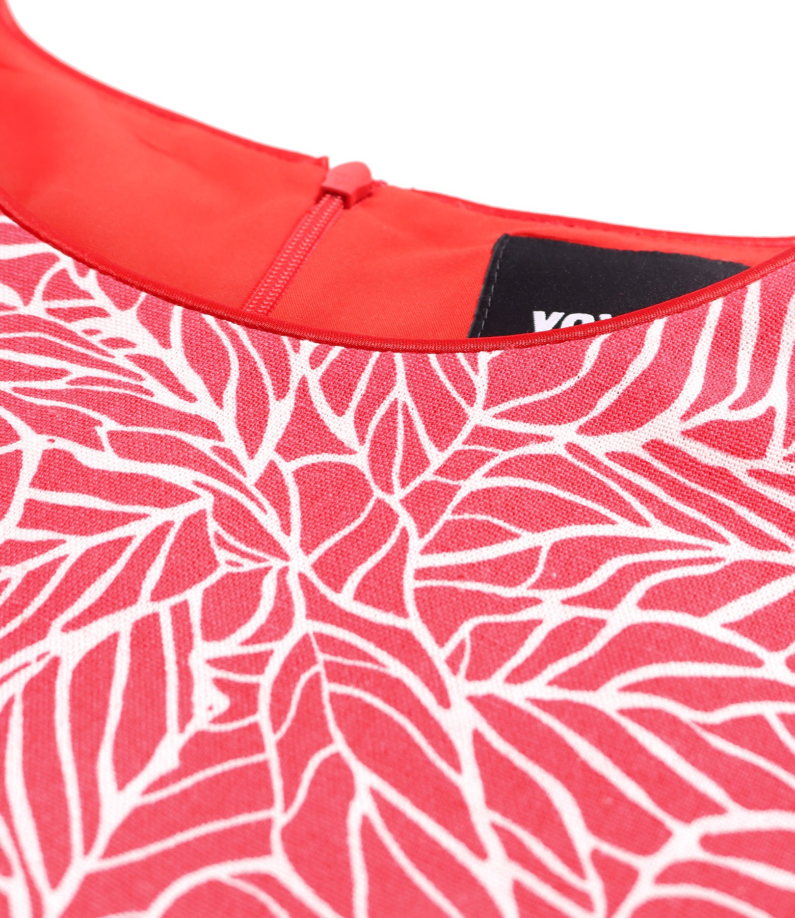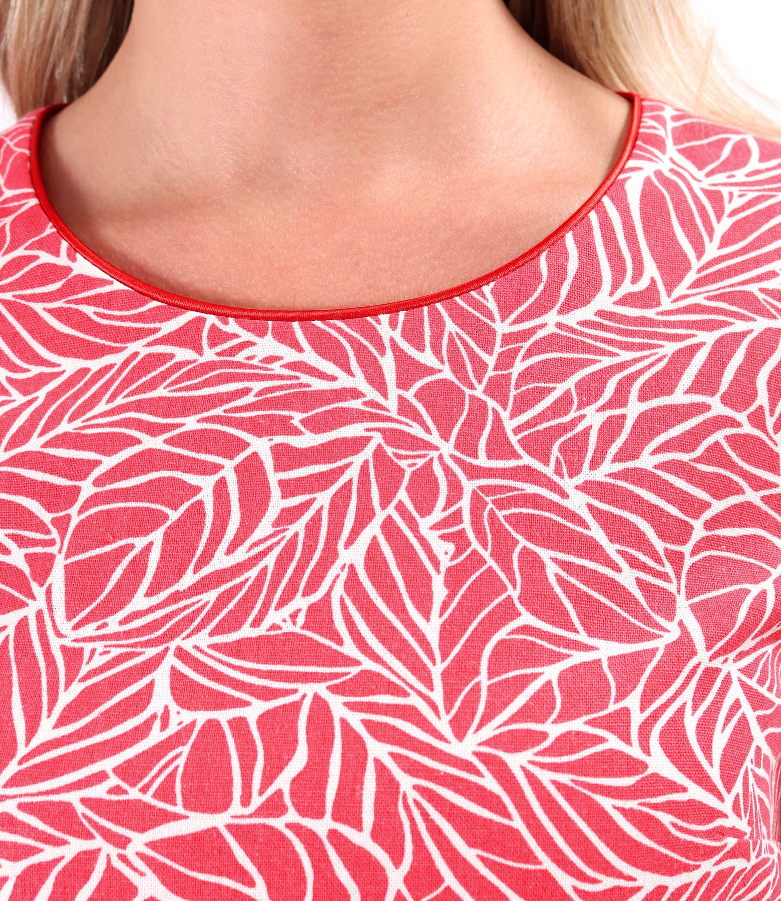 Casual dress with linen printed with floral motifs, short sleeves, round neckline and side pockets. Concealed zipper closure at center back.
