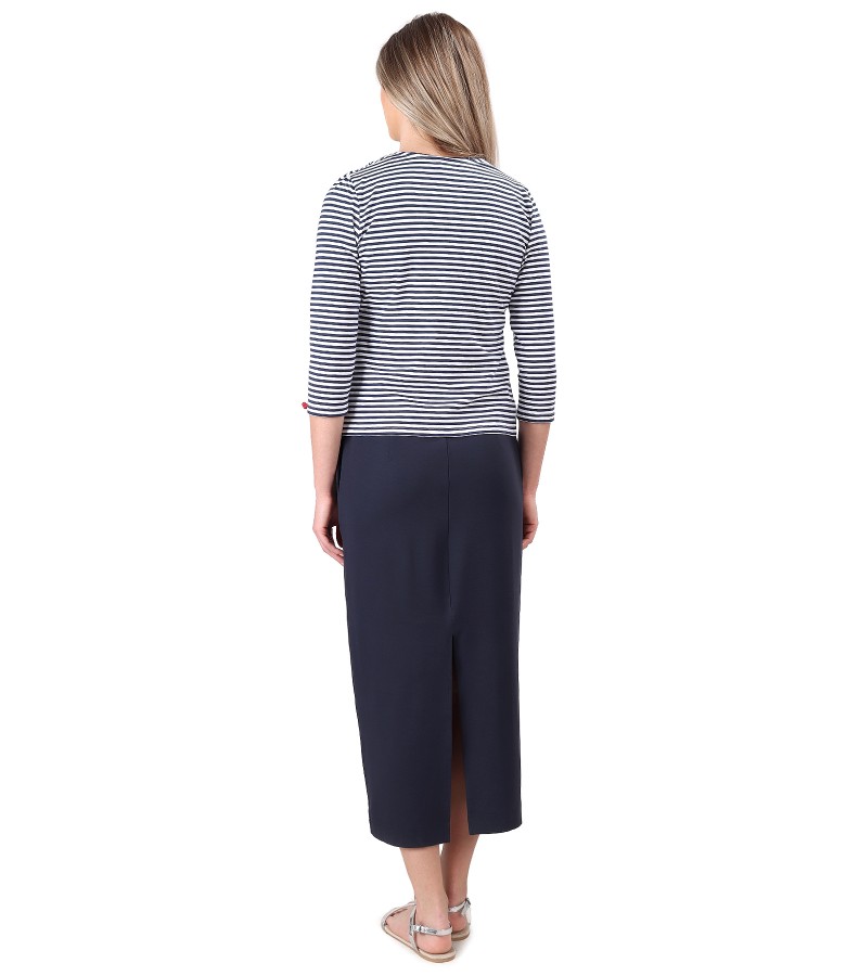 Casual outfit with long dress in elastic jersey and blouse tied with rips cord