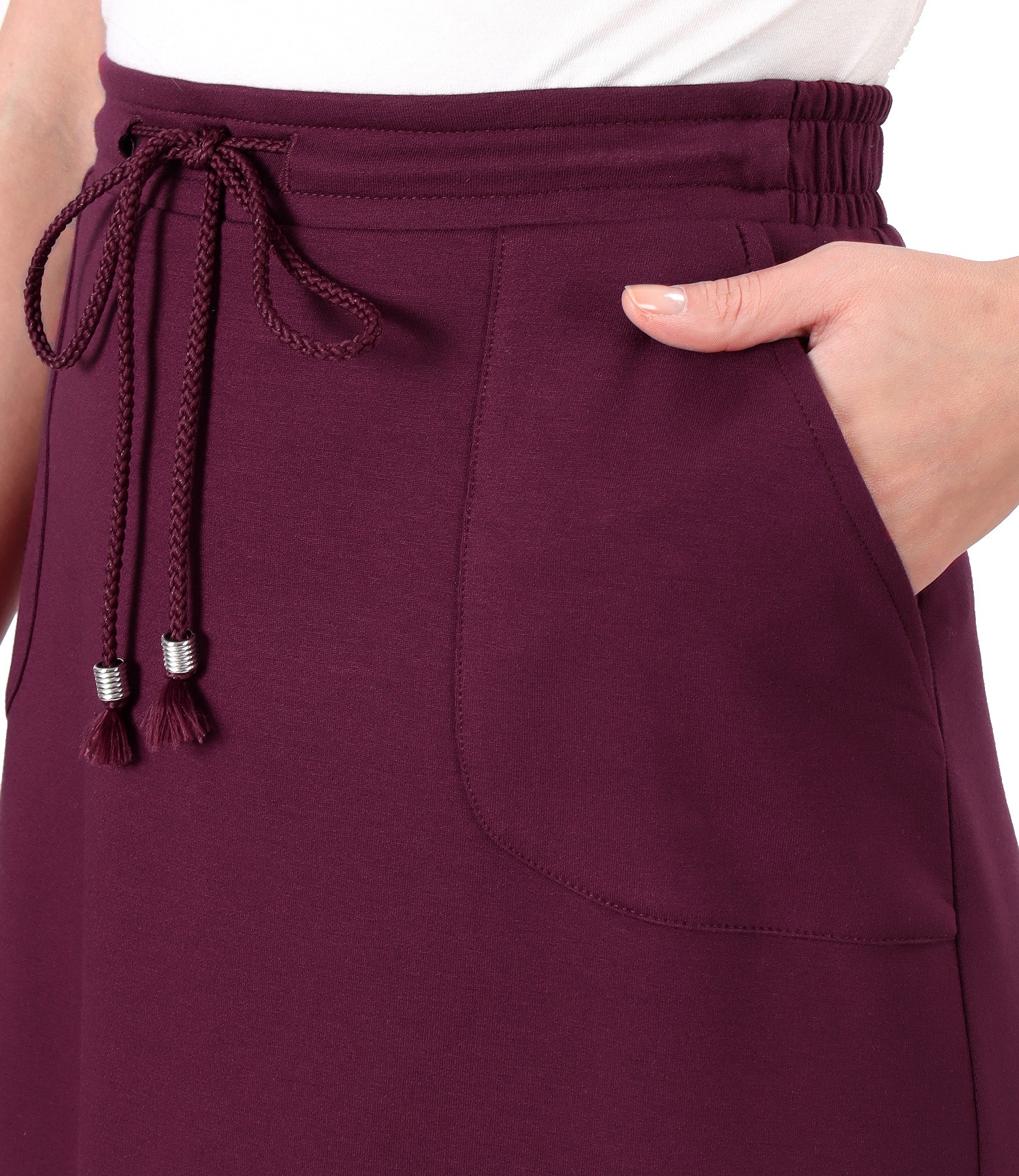 Casual skirt made of thick elastic viscose jersey, unlined, with side pockets and elastic with drawstring at the waist.