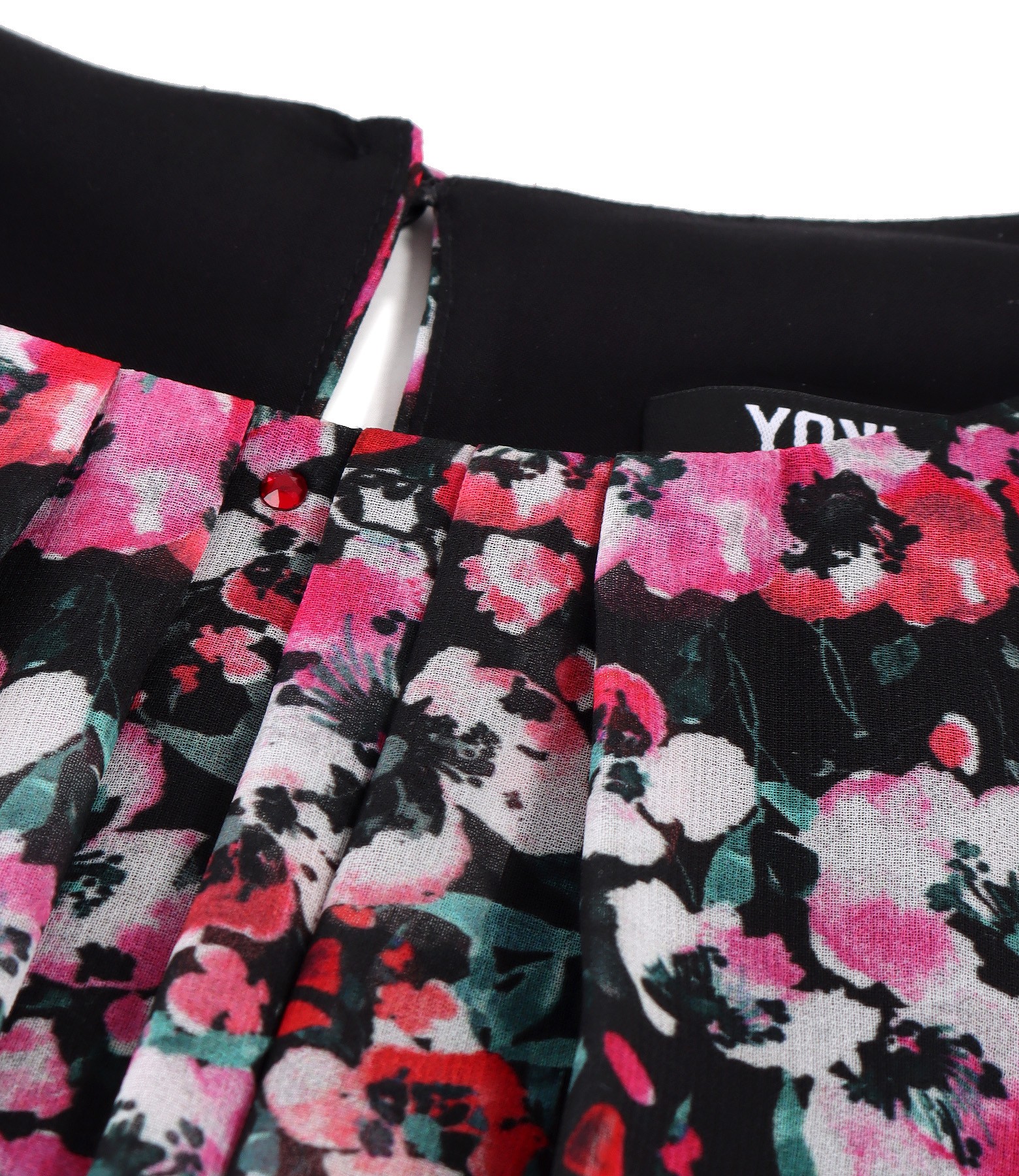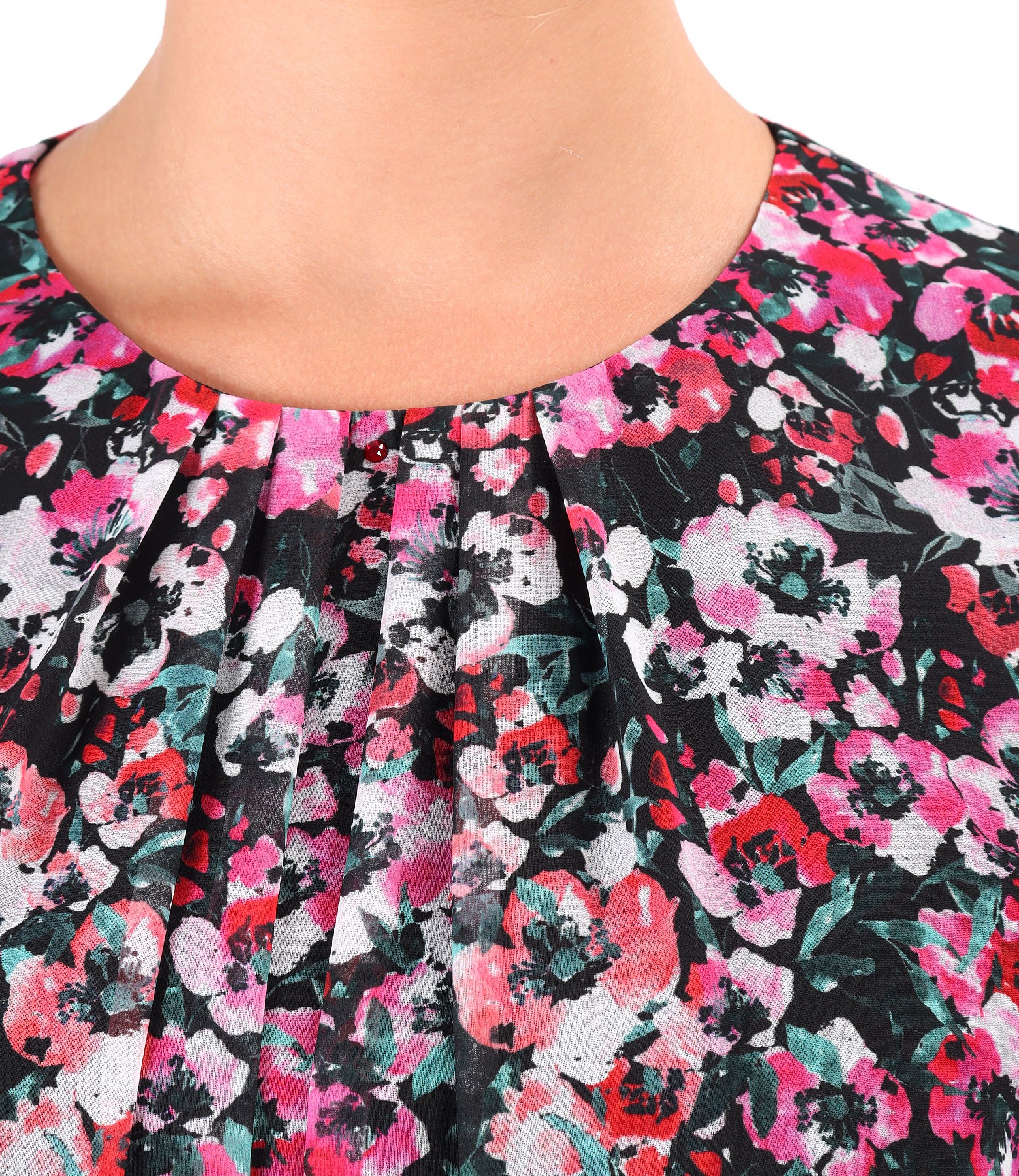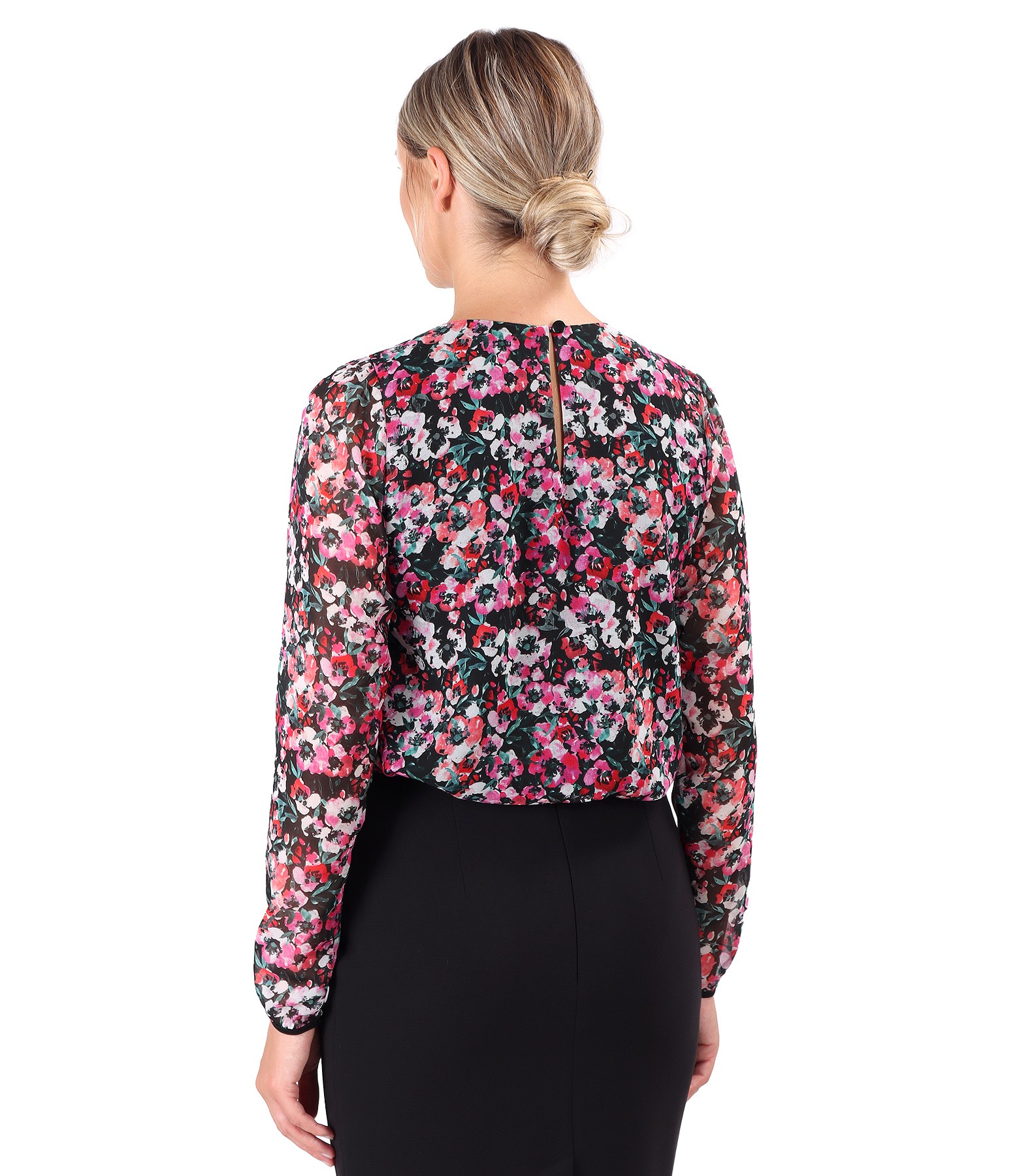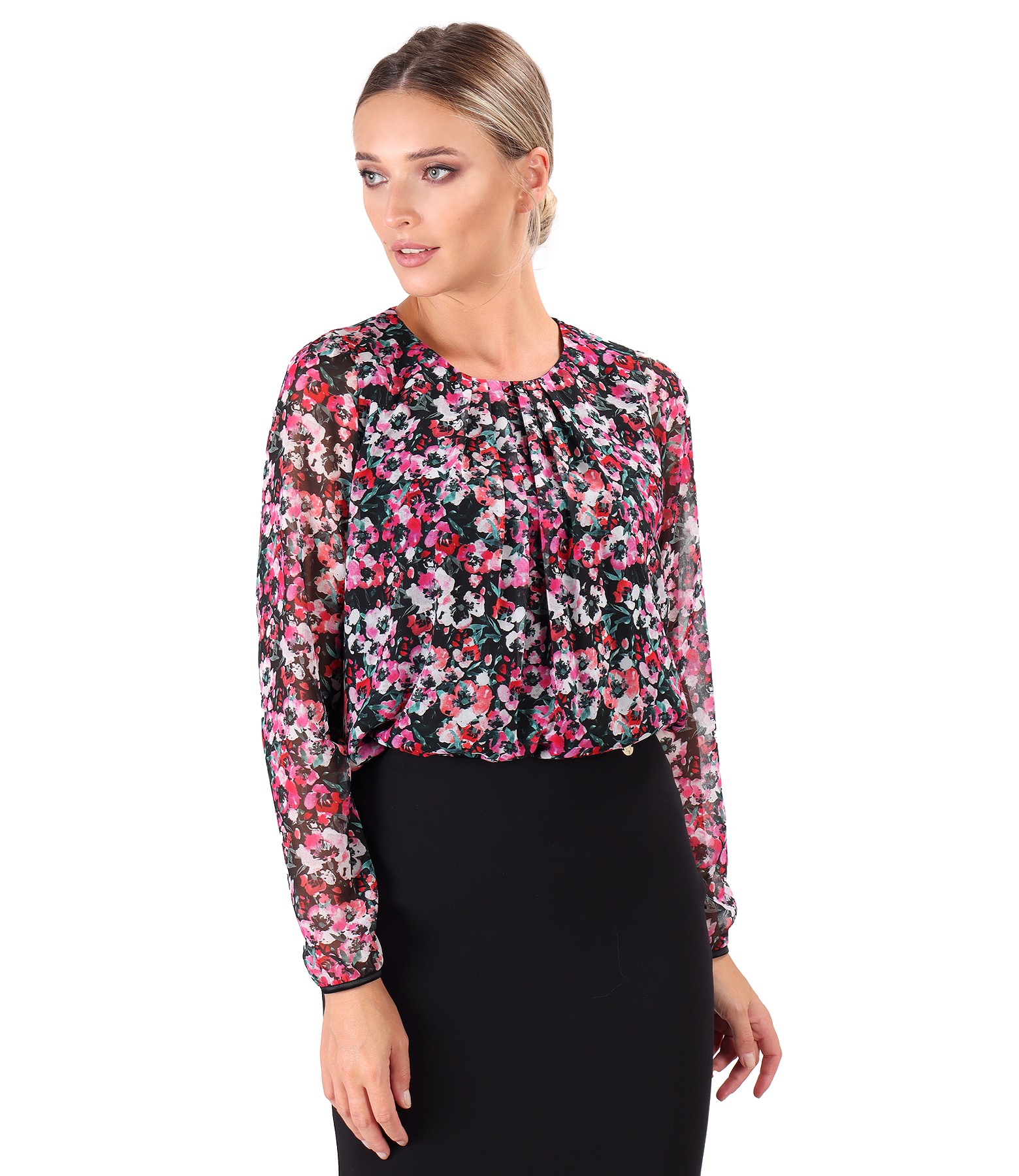 Casual blouse made of veil printed with floral motifs, doubled with viscose, with long sleeves, pleats on the decolletage and crystal application. It closes with a button on the middle back.