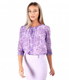 Casual blouse made of veil printed with floral motifs, doubled with viscose, with 3/4 sleeves, pleats on the decolletage and crystal application. It closes with a button on the middle back.