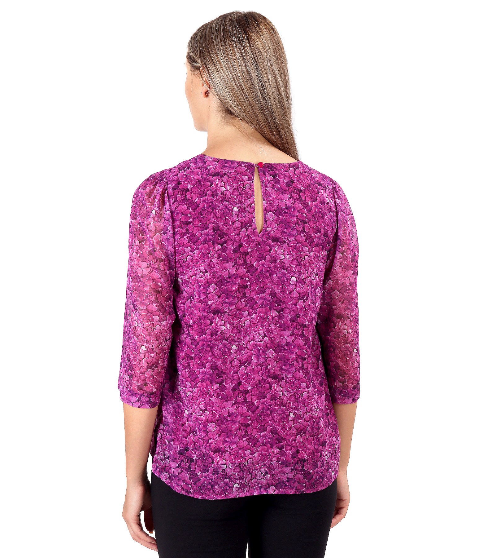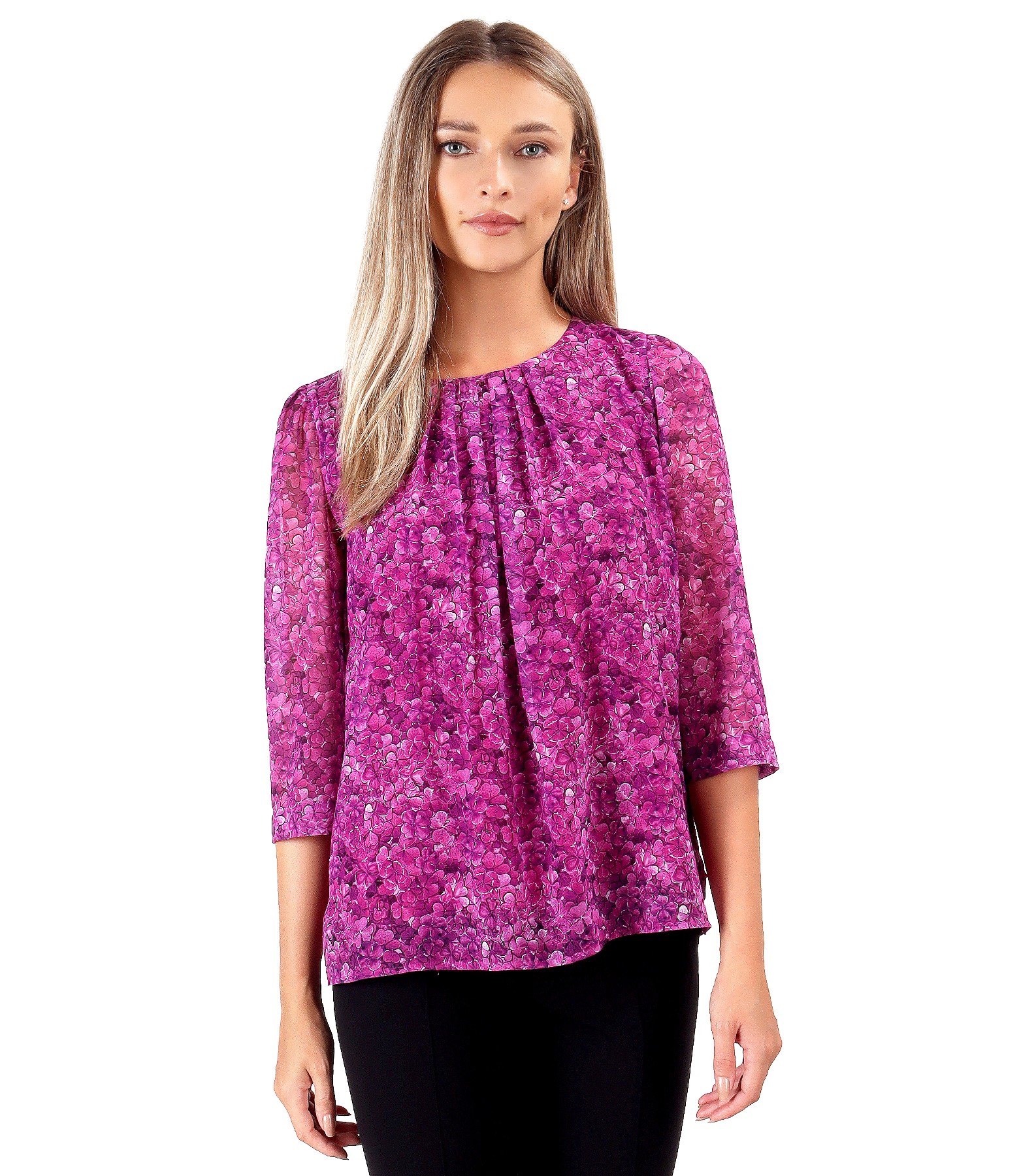 Casual blouse made of veil printed with floral motifs, doubled with viscose, with 3/4 sleeves, pleats on the decolletage and crystal application. It closes with a button on the middle back.