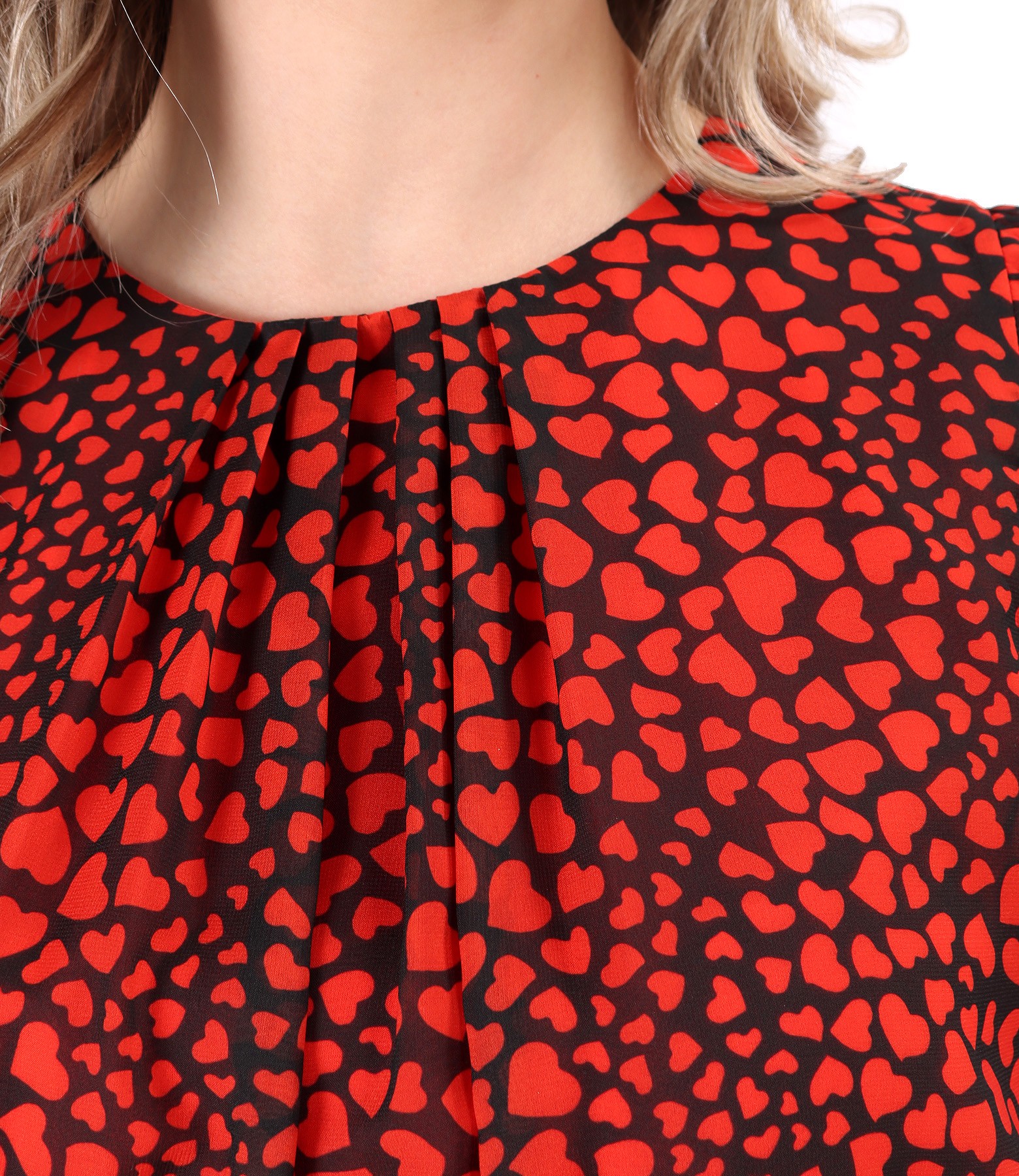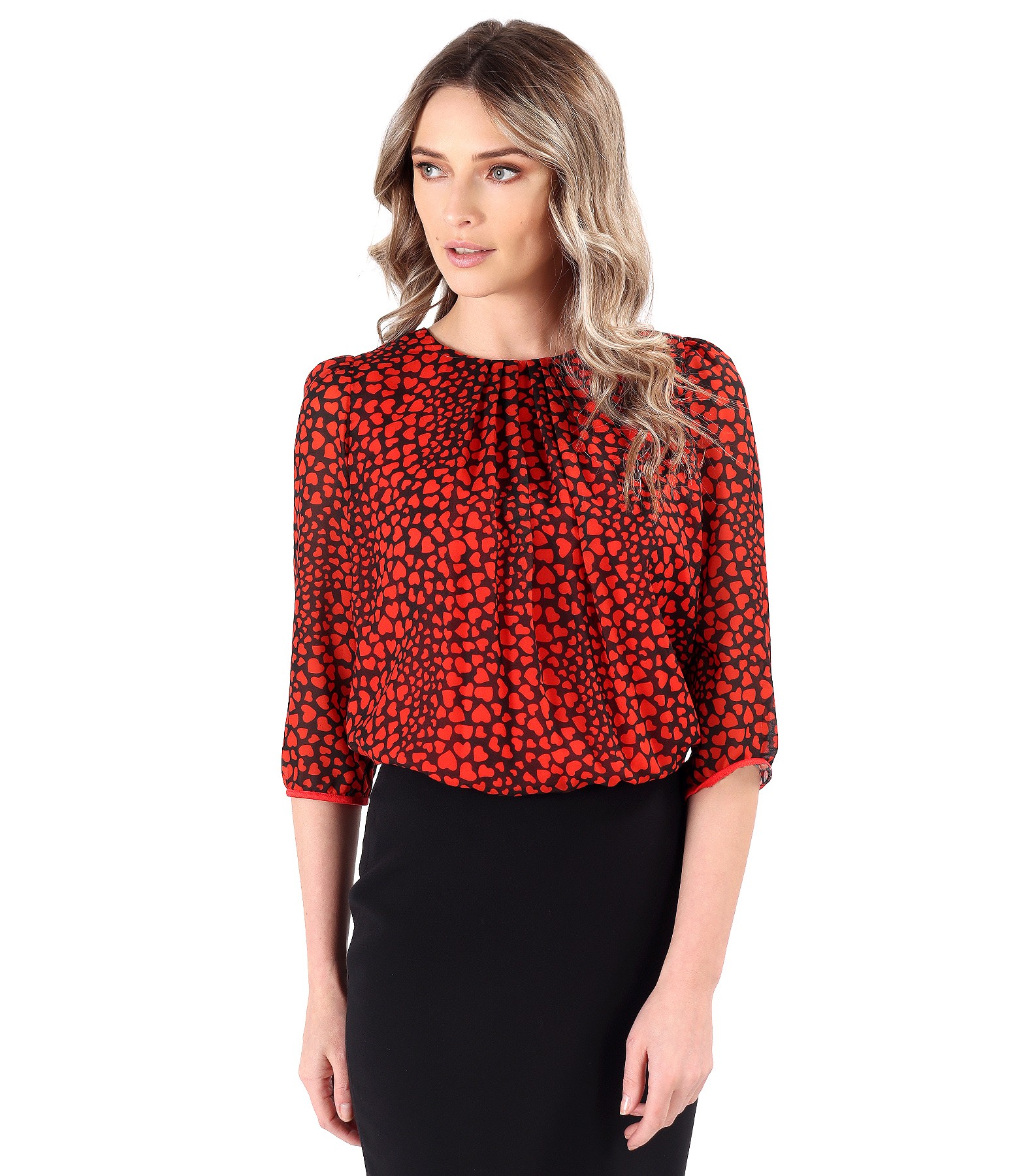 Elegant blouse made of printed veil, doubled with viscose, with 3/4 sleeves and round neckline. It closes with a button on the middle back.