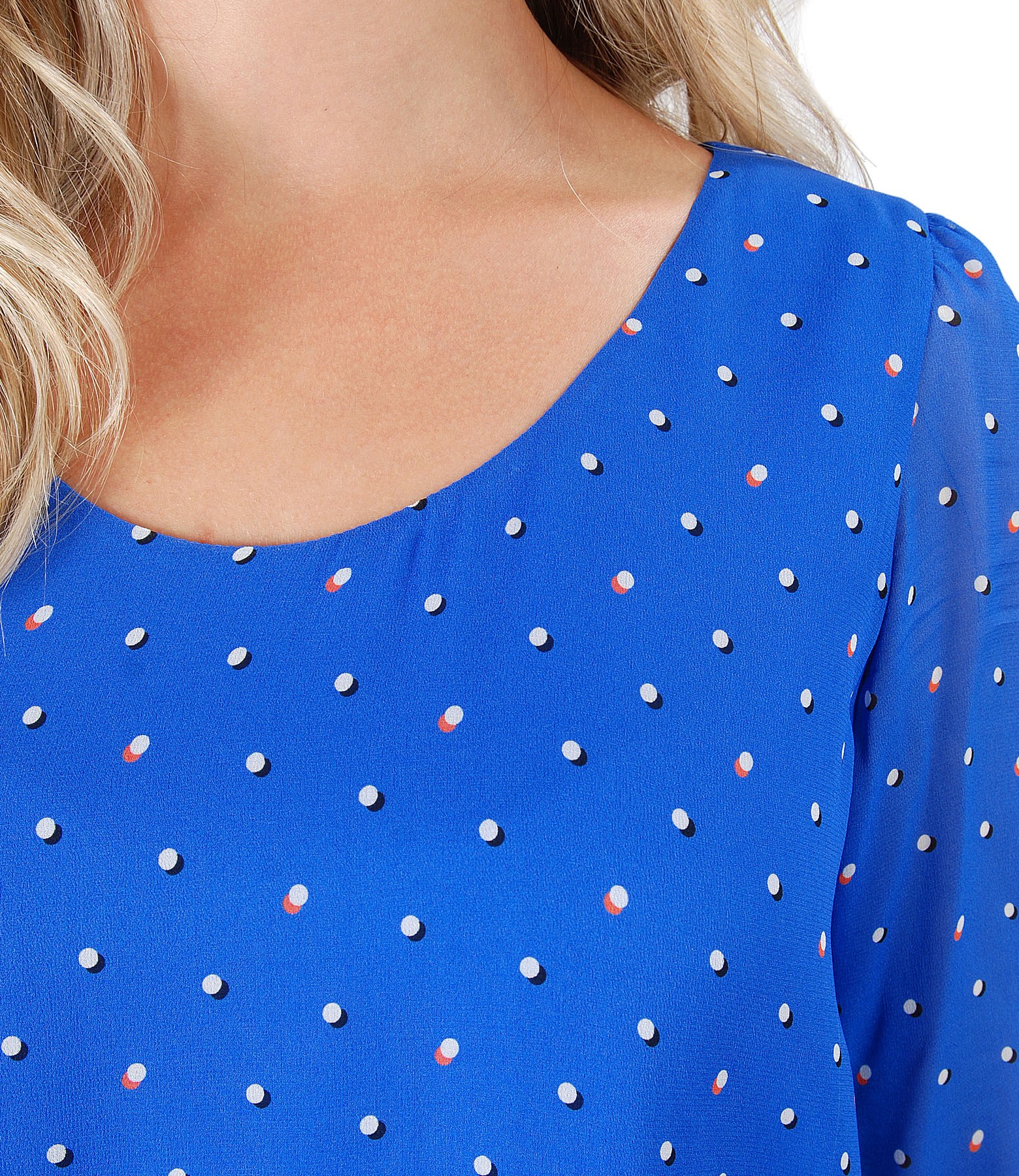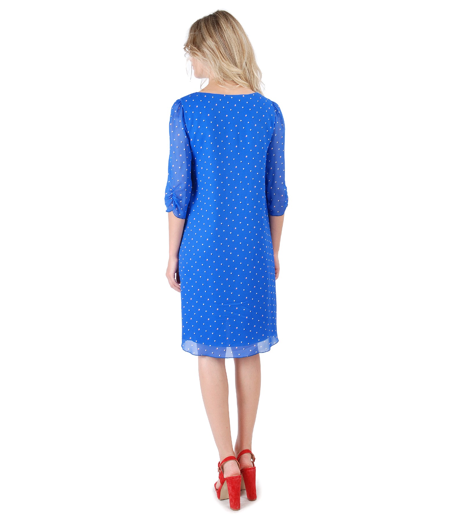Casual viscose dress with lace corner print, doubled with viscose, with round low-cut neck and 3/4 sleeves.