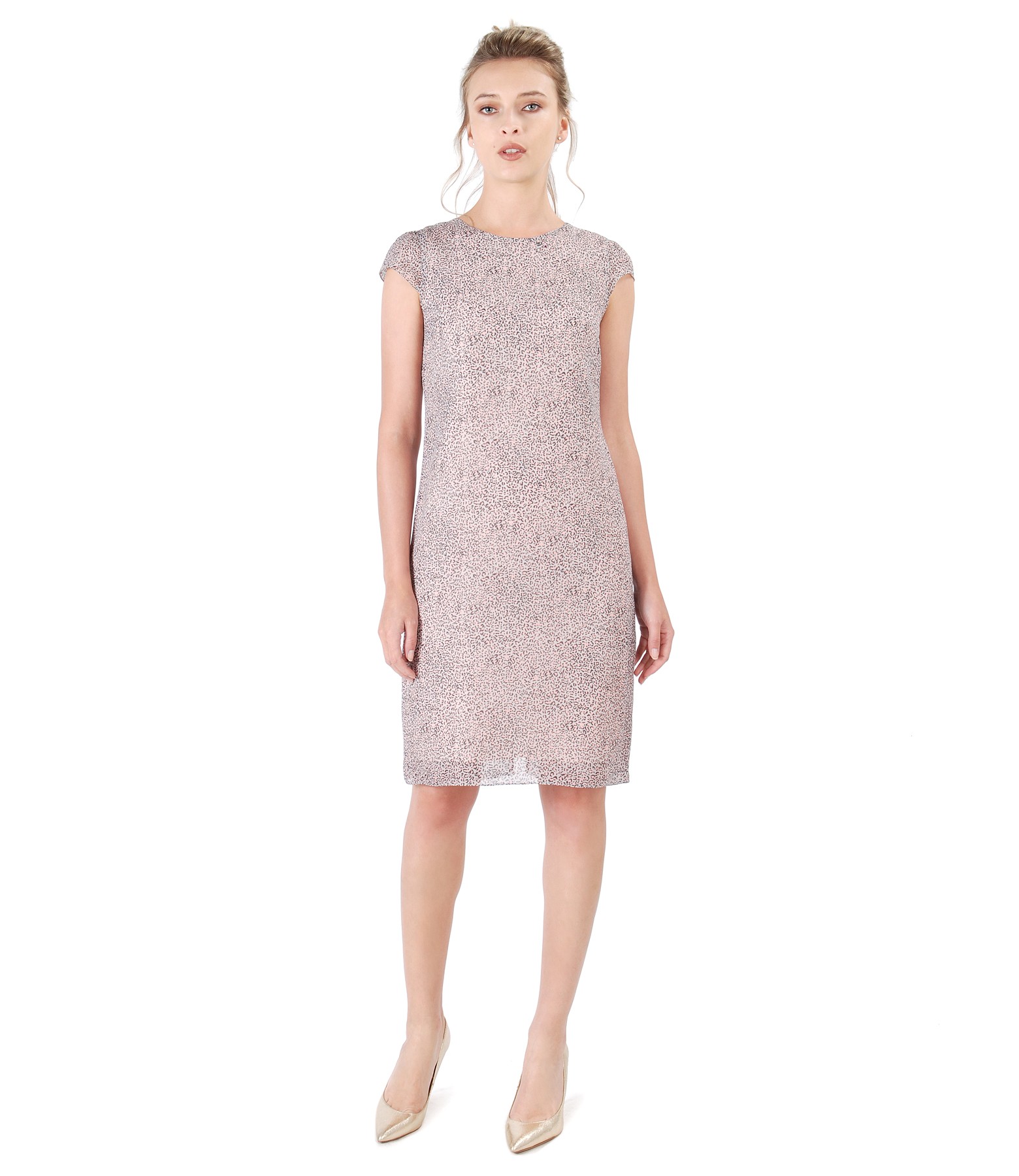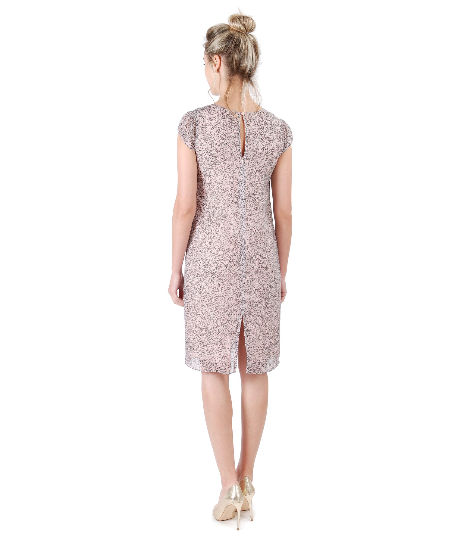 Viscose dress with animal print, doubled with viscose, short sleeves and round low-cut neck, embellished with crystals on decolletage. Closes with a button and a zipper on the middle back.
