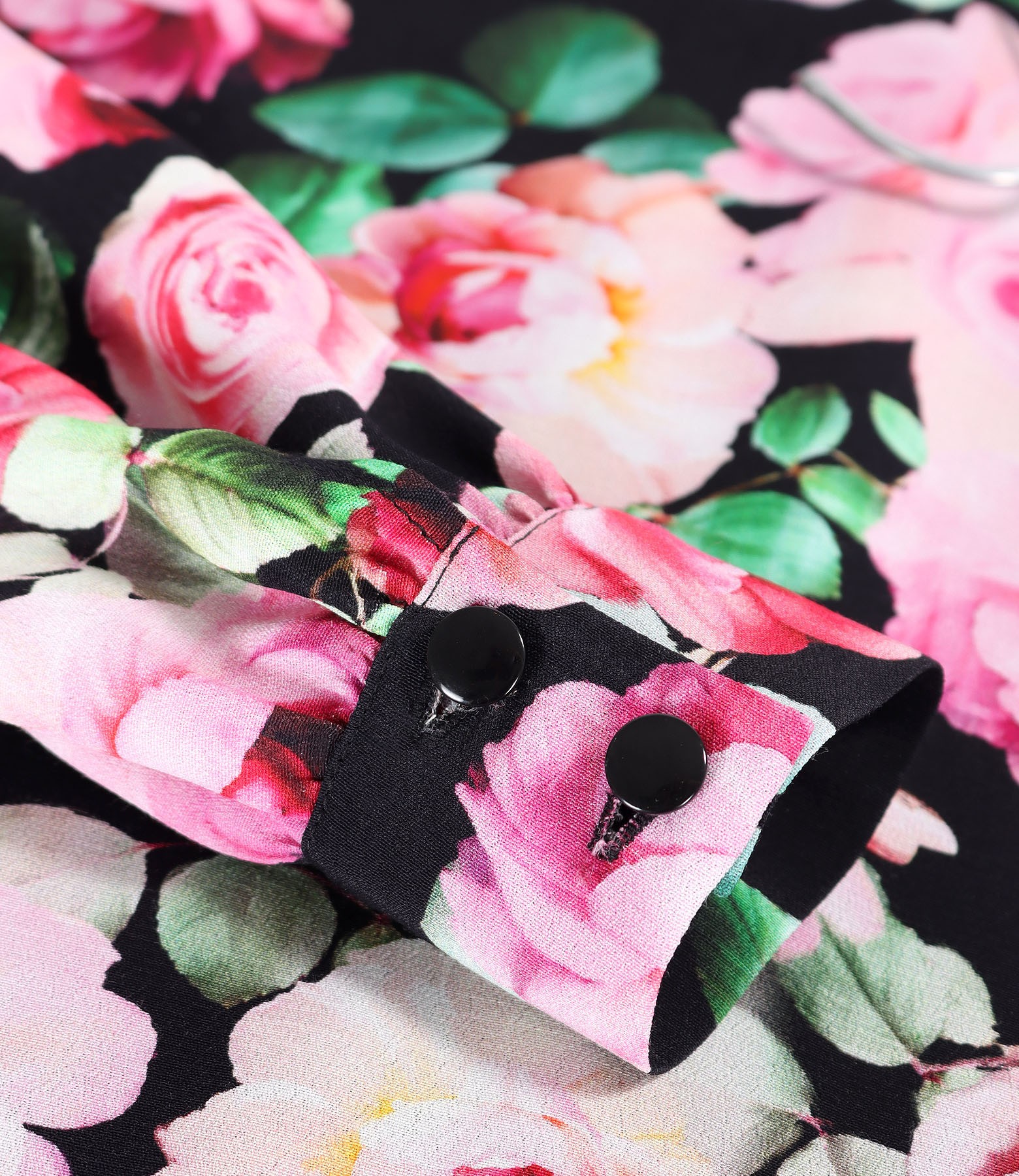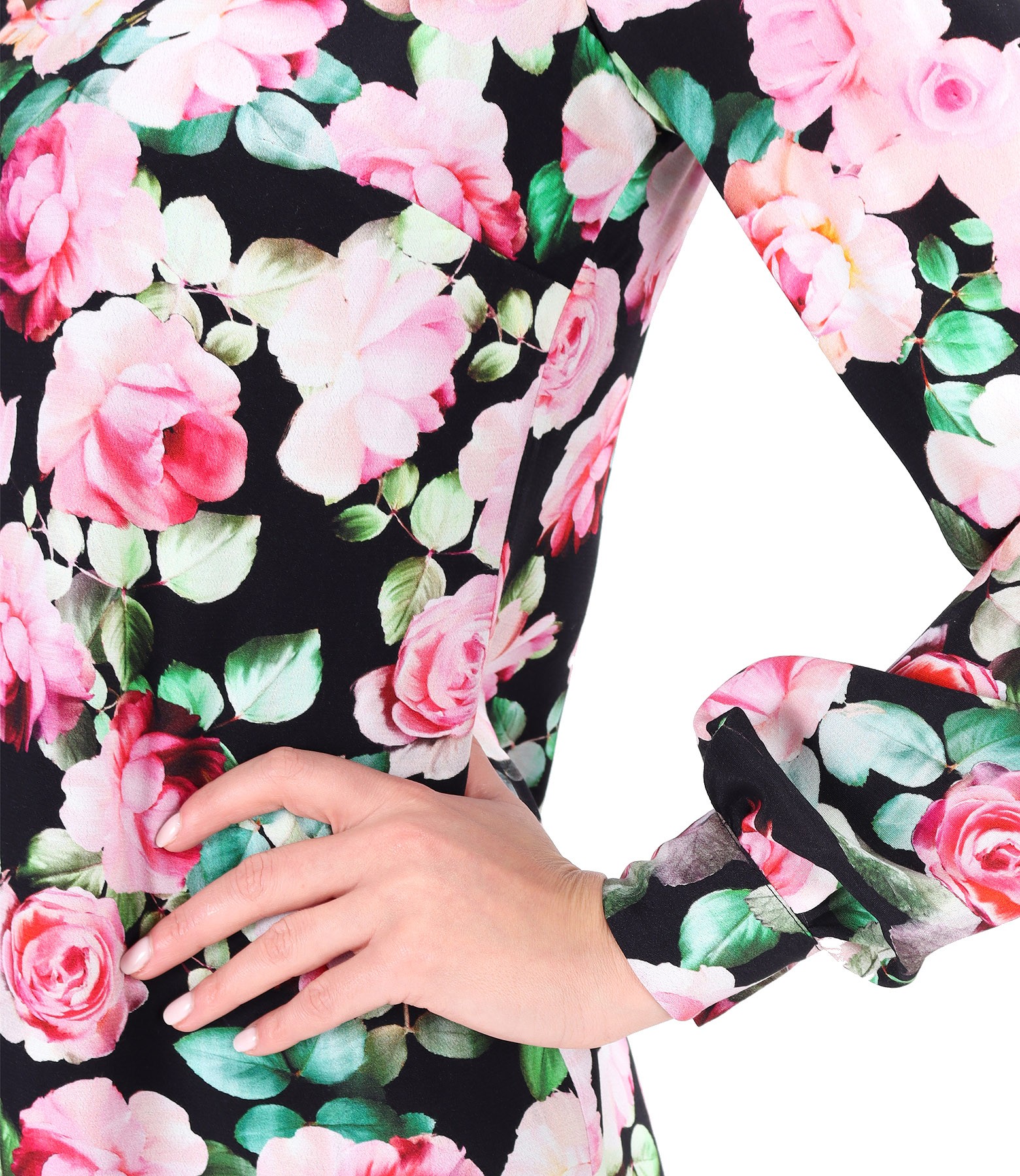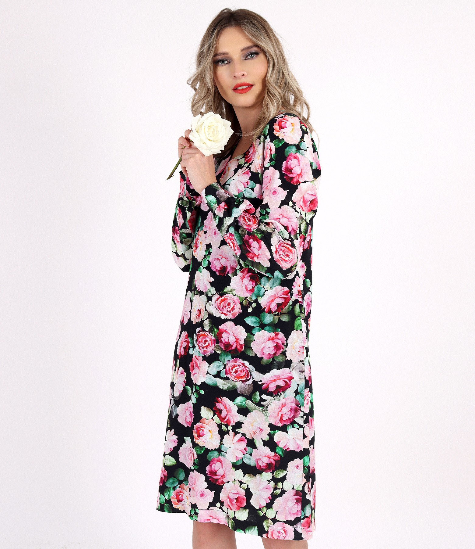 Casual viscose satin dress printed with flowers, doubled with viscose, V-neckline, and long sleeves wrinkled with cuffs of the same material with 2 buttons.