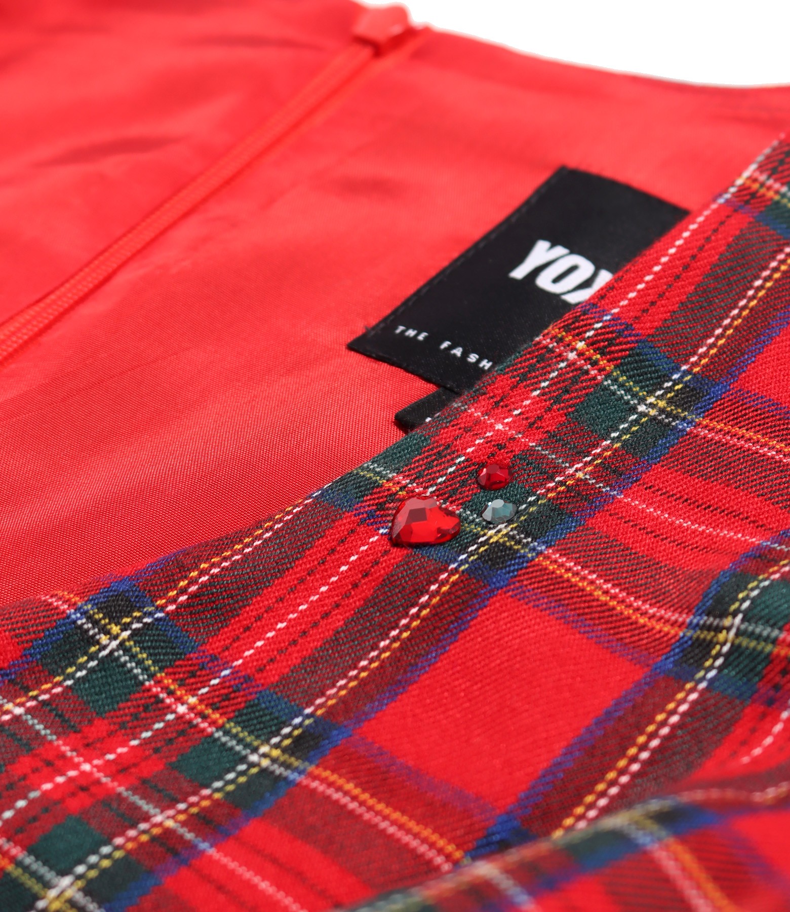 Checkered midi dress, padded, with 3/4 sleeves, side pockets and V decolletage embellished with crystals. Closes with a zipper hidden in the middle of the back.