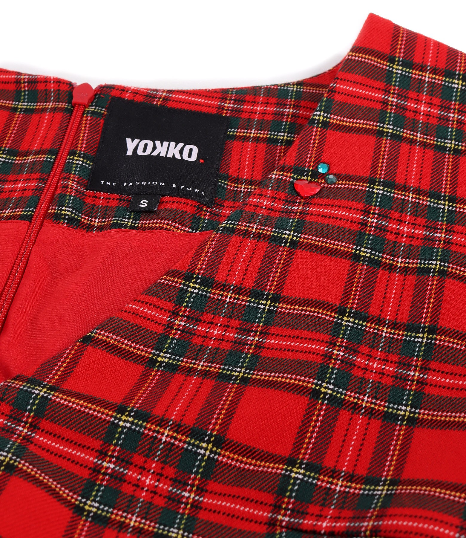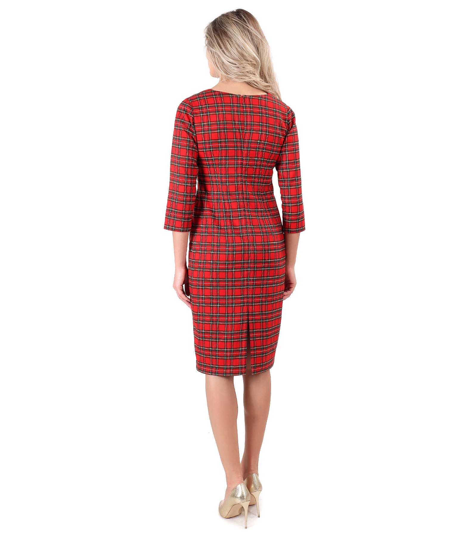 Checkered midi dress, padded, with 3/4 sleeves, side pockets and V decolletage embellished with crystals. Closes with a zipper hidden in the middle of the back.