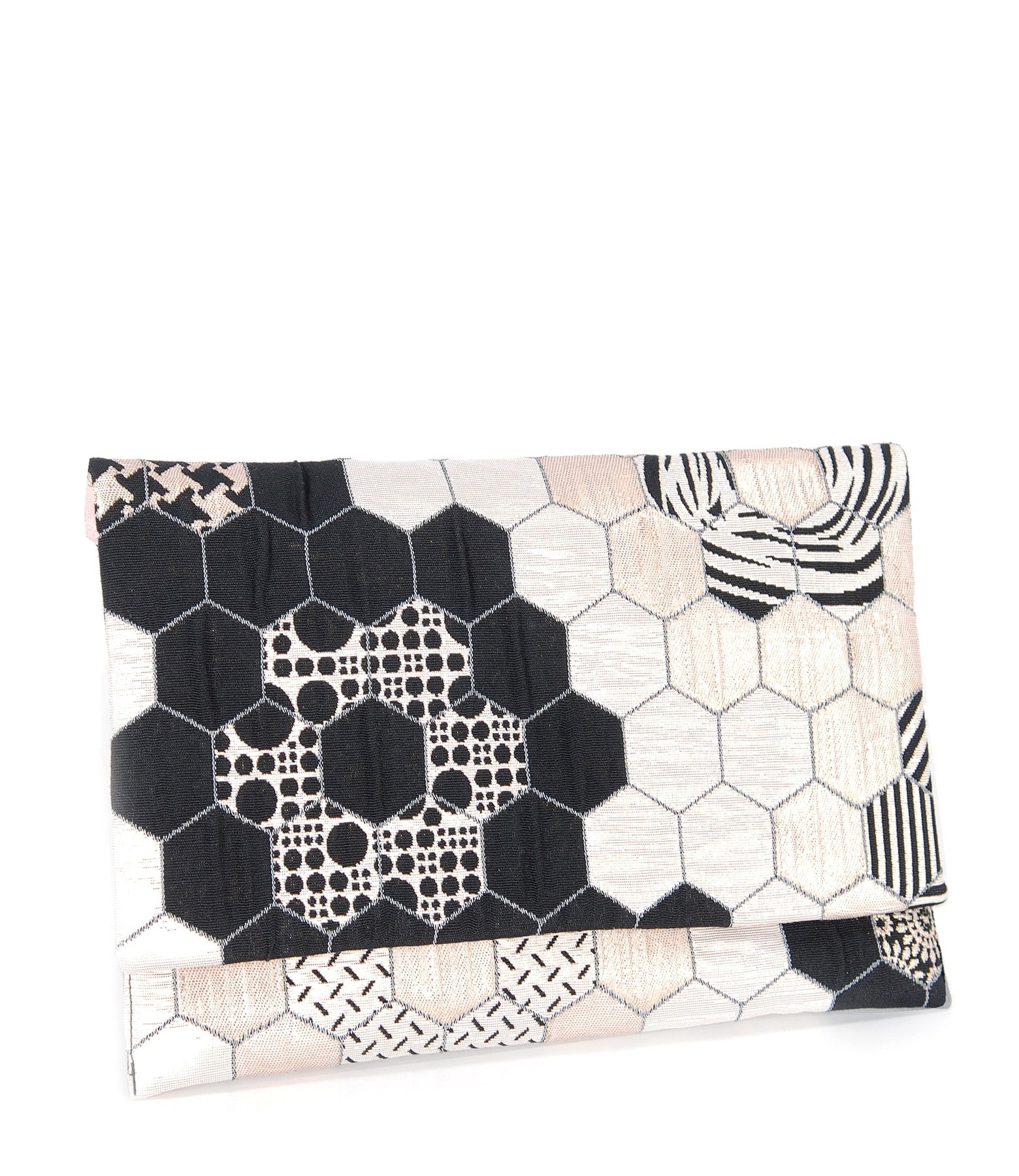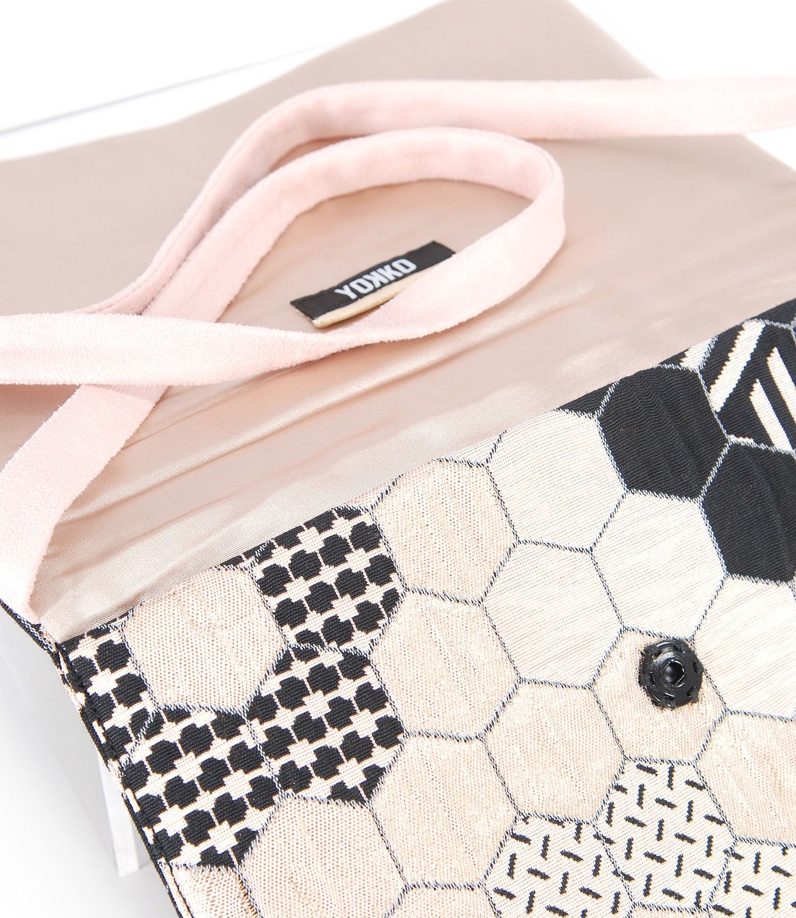 Clutch of brocade with cotton and effect thread, with shoulder belt. Closes with a central staple. The print position varies per product.