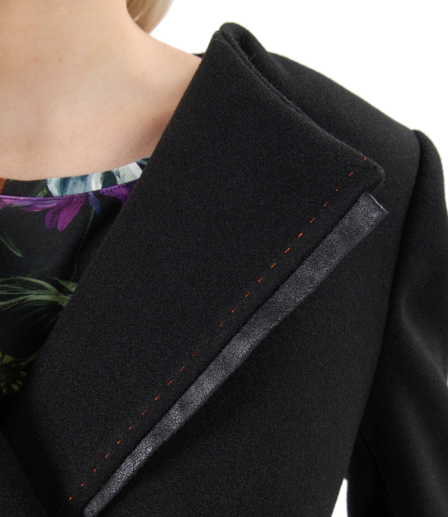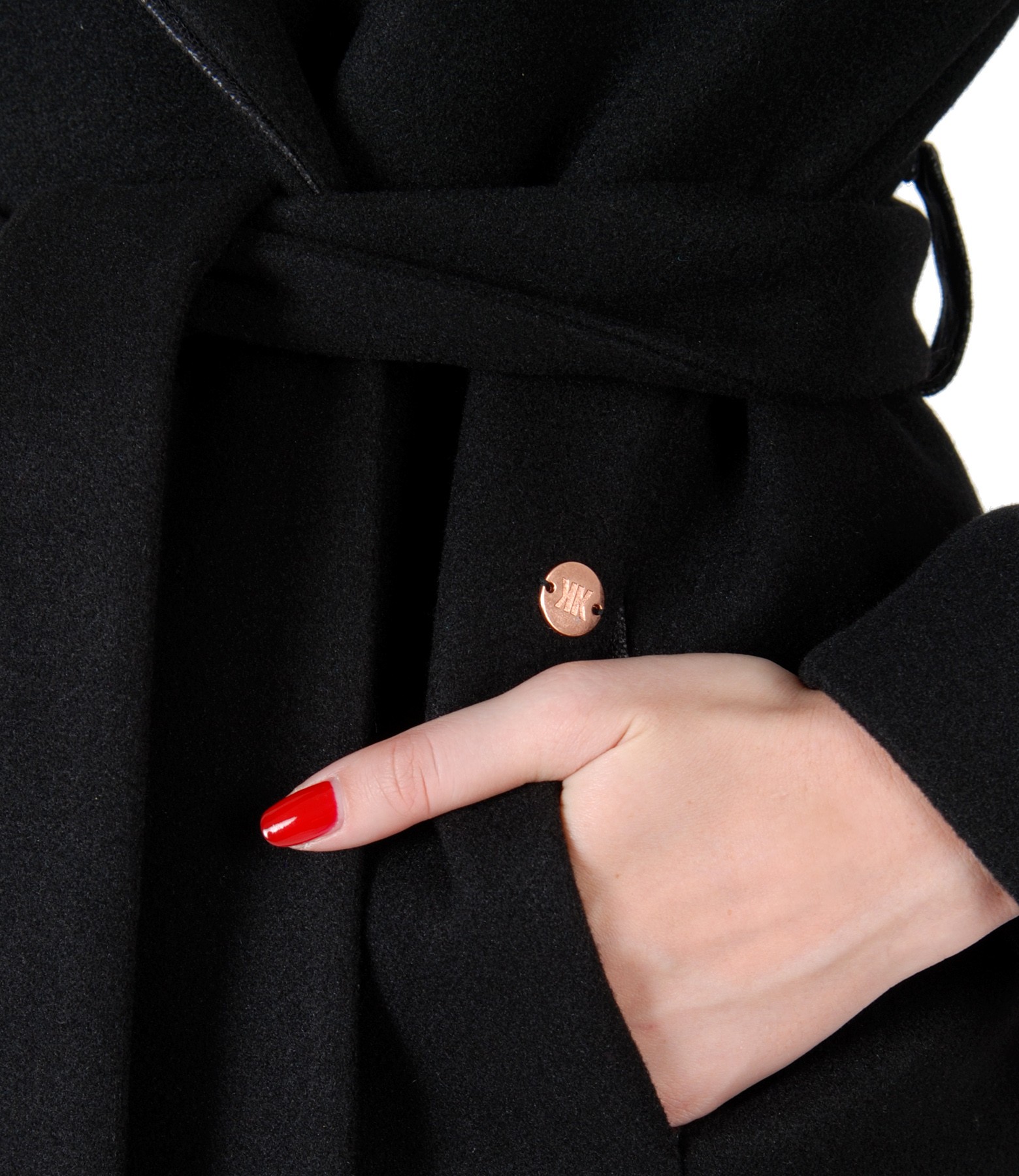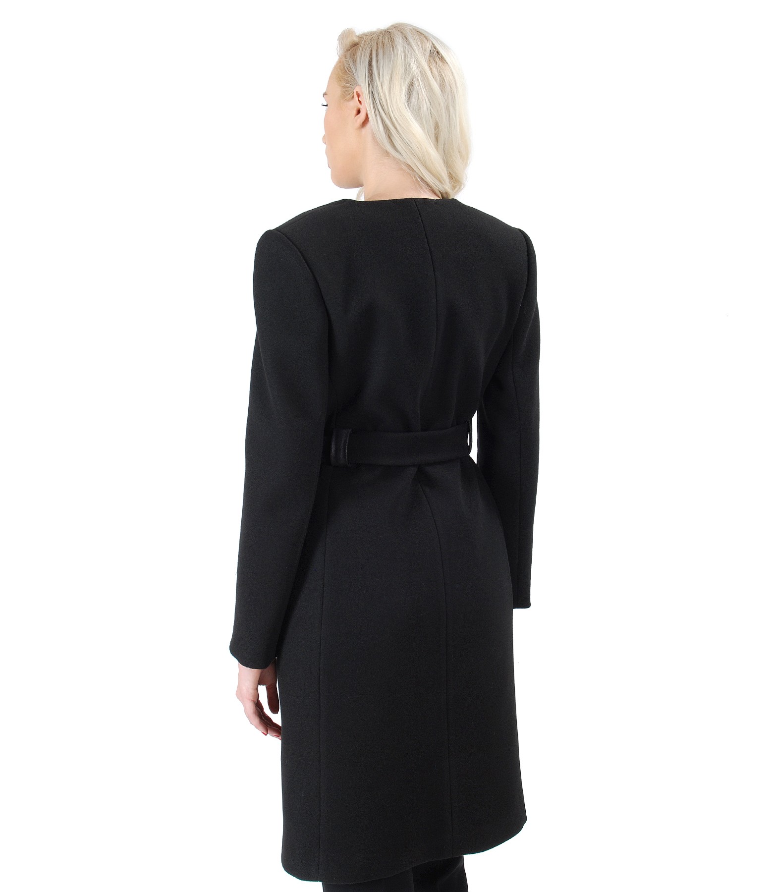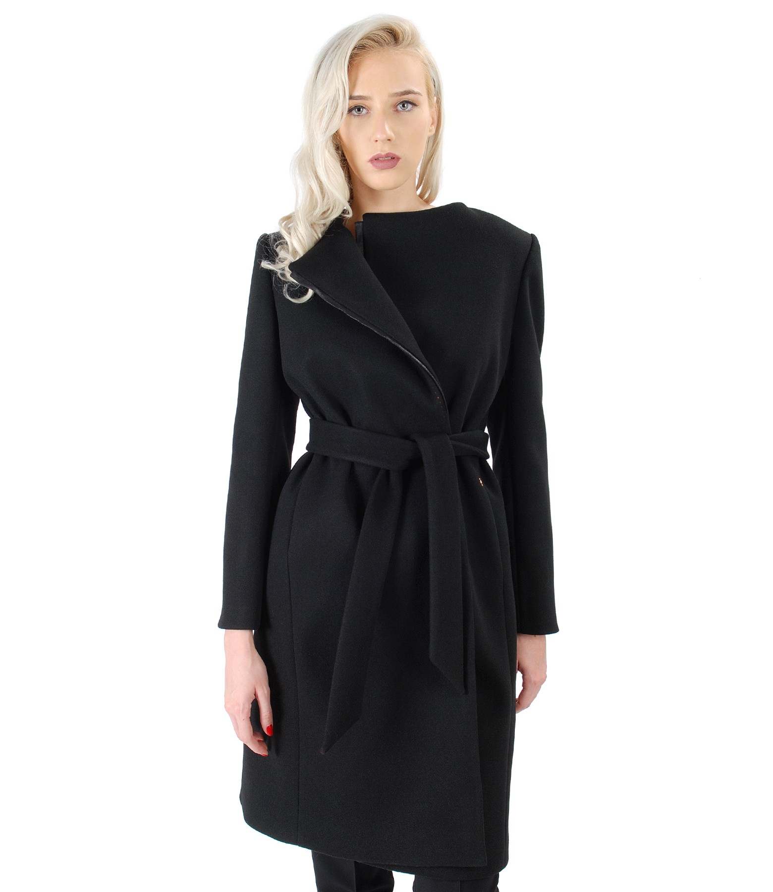 Coat without a collar of thick elastic fabric, with elastic lining, embossed lapel with eco-leather lining and decorative stitching of brass and hidden side pockets. It closes with a counter-button and tightens at the waist with a detachable cord.