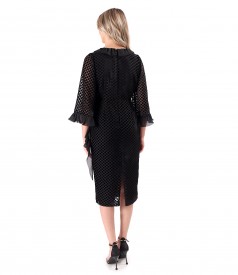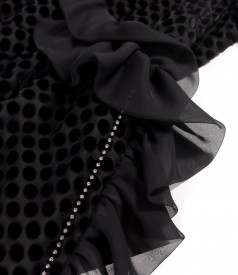 Cocktail dress made of veil with velvet polka dots, with wide semi-long sleeves, a wrap-around bodice and a slit at the center back. It has veil ruffles at the end of the sleeves and at the neckline, crystals on the right side, and is doubled with viscose. It closes with a hidden zipper at the center back.
