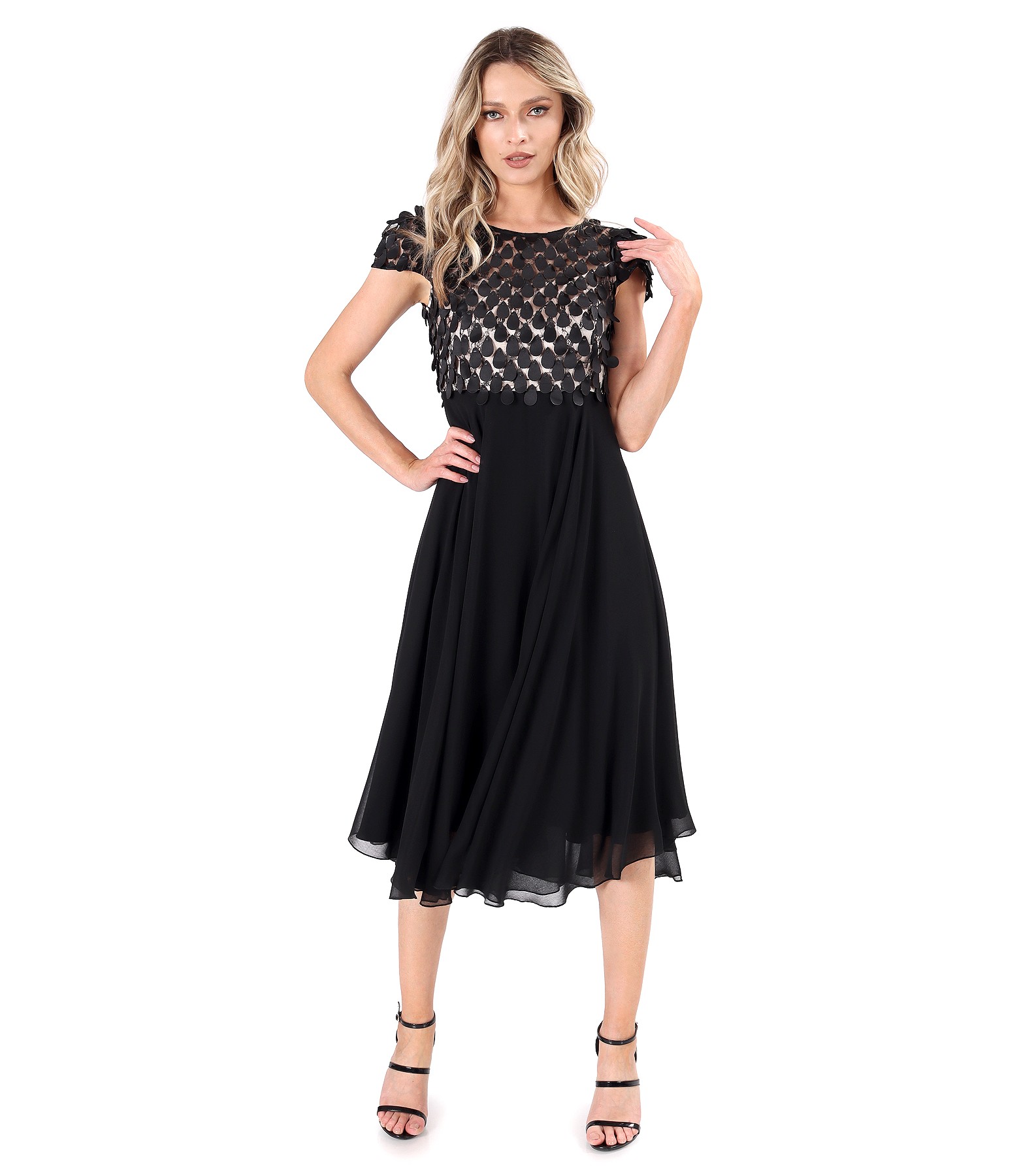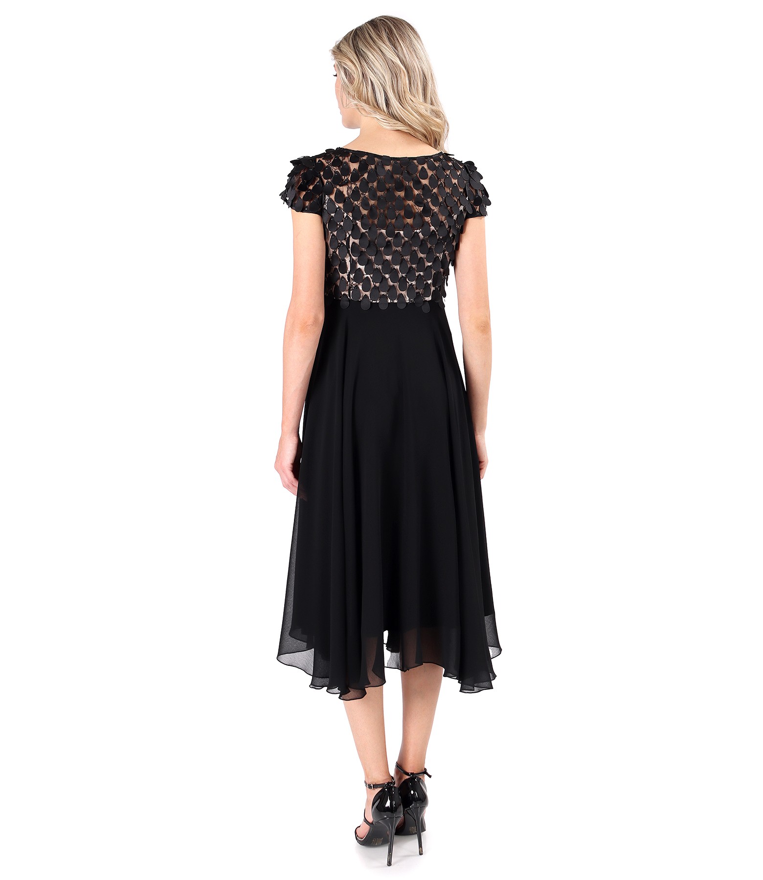 Cocktail dress, with veil skirt, padded, with lace corset with petals. Closes with hidden zipper on the left side.