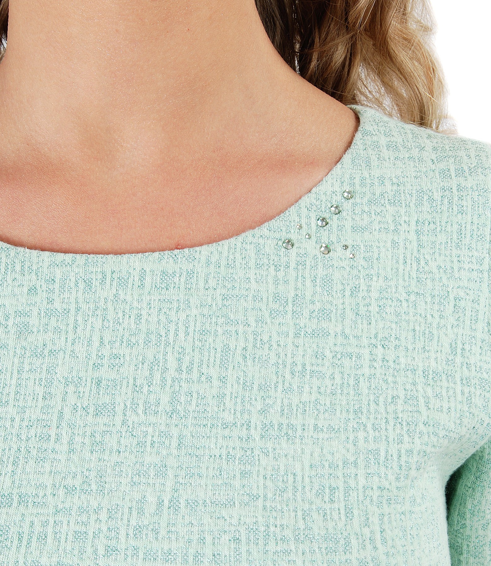 Cotton dress with effect thread, lined, with round low-cut neck, short sleeves, embellished with crystals on decolletage. Closes with hidden zipper on the middle back.