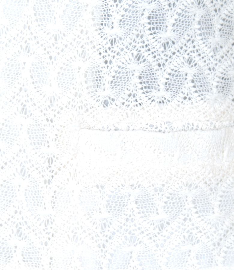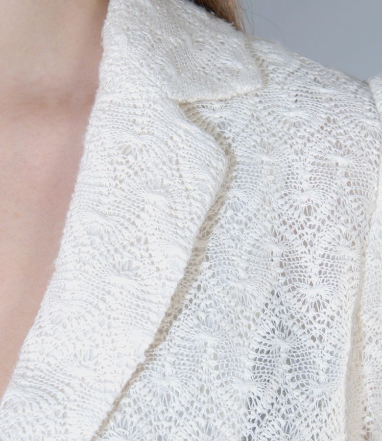Cotton lace jacket, doubled with cotton, with V neckline and side pockets. Closes with 3 hooks on front.