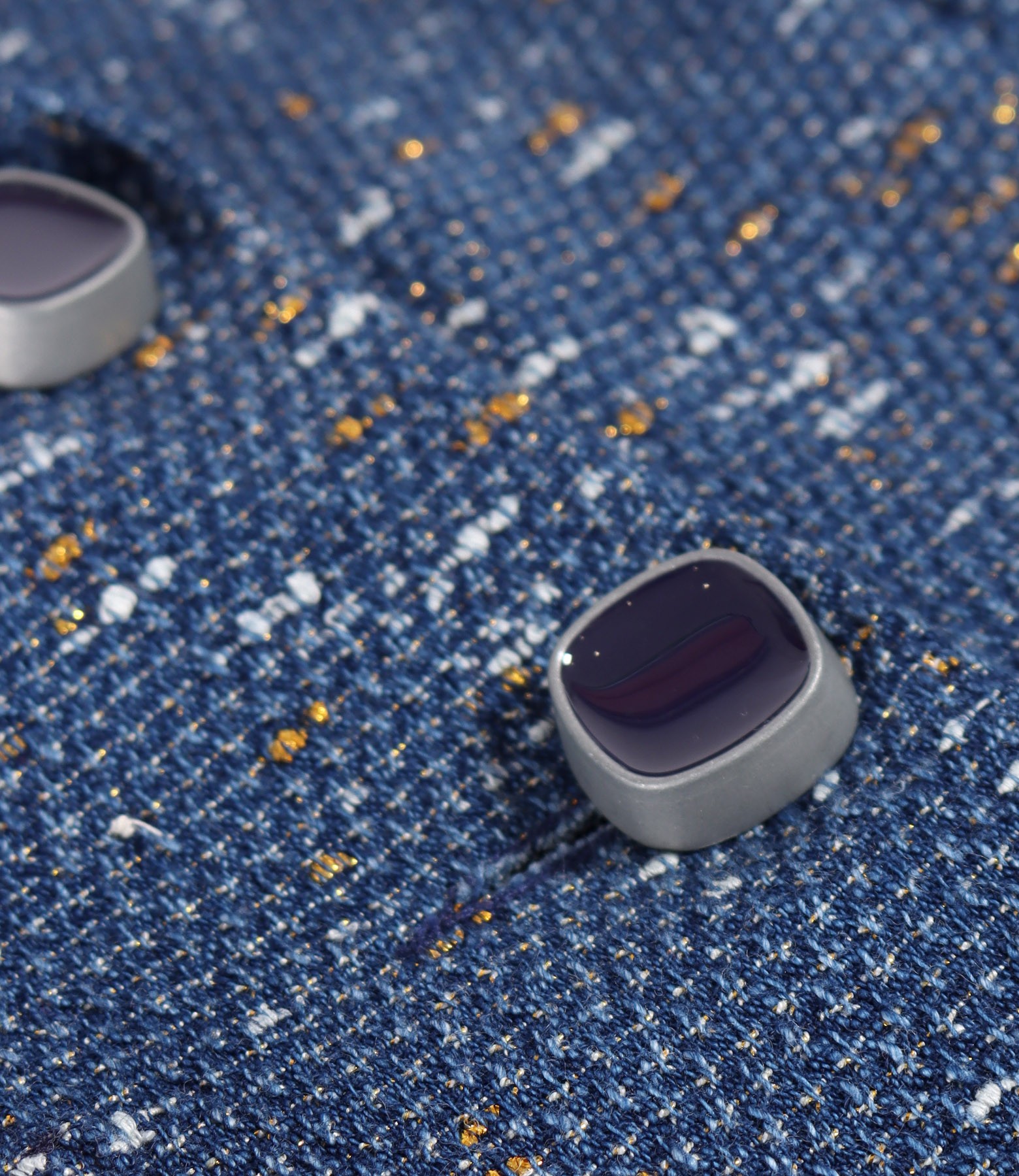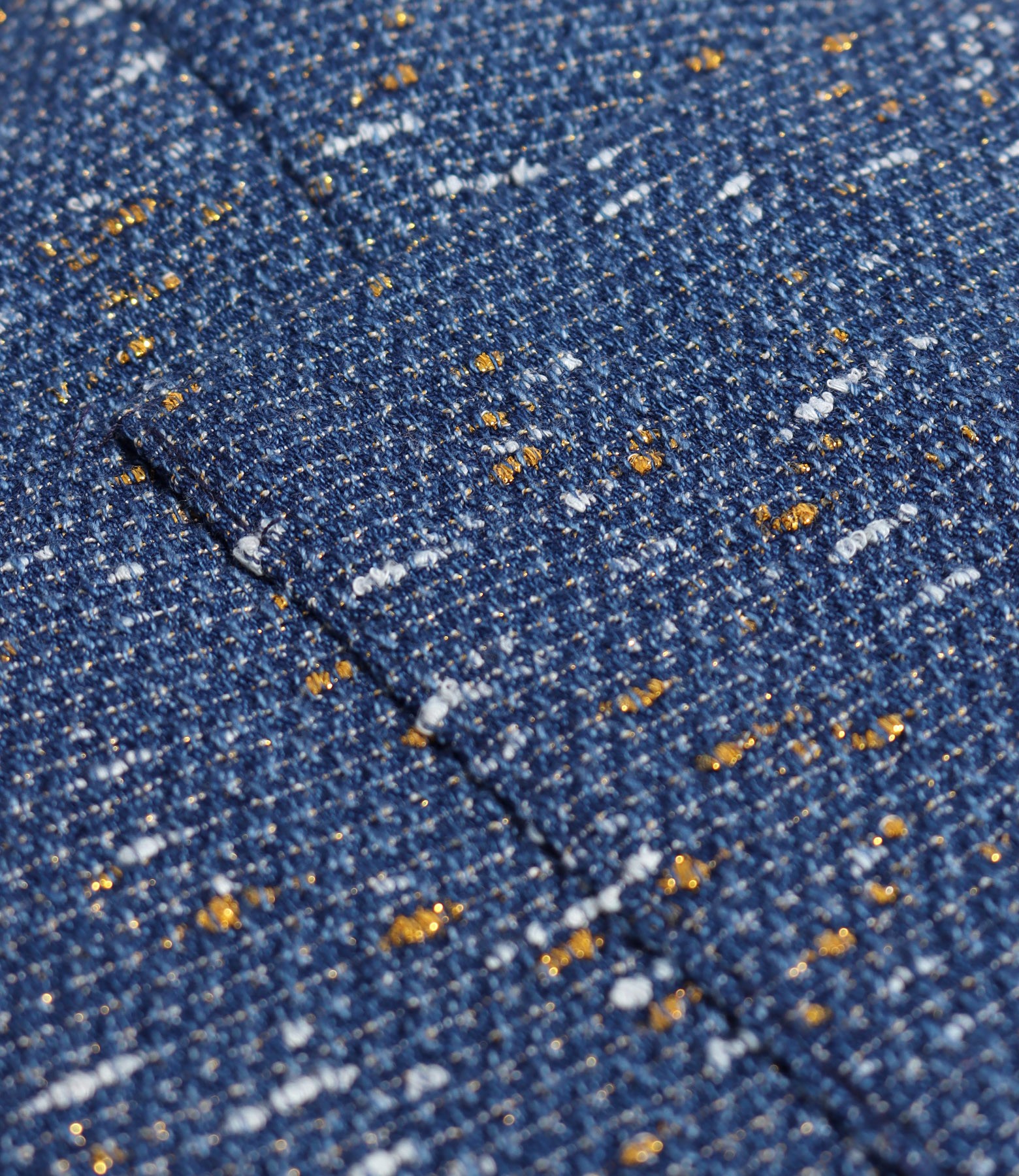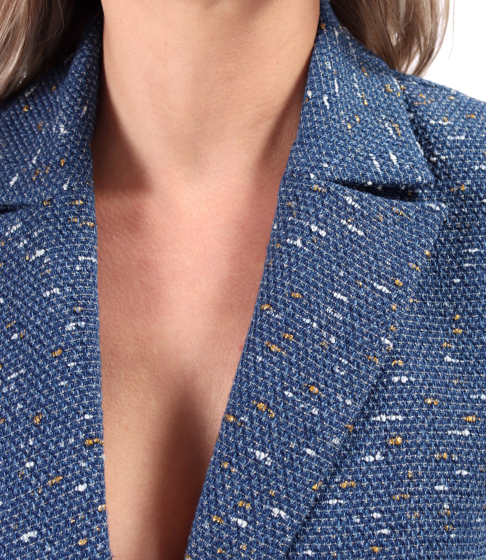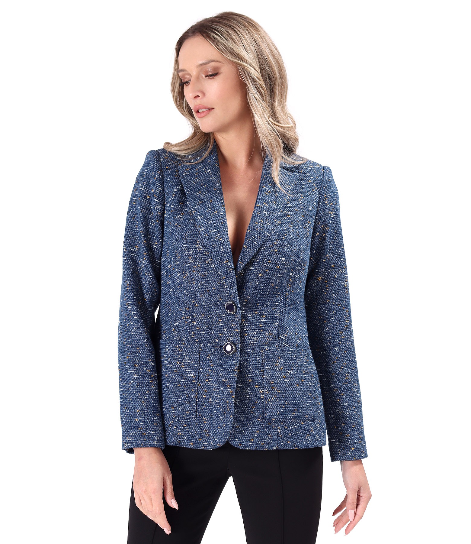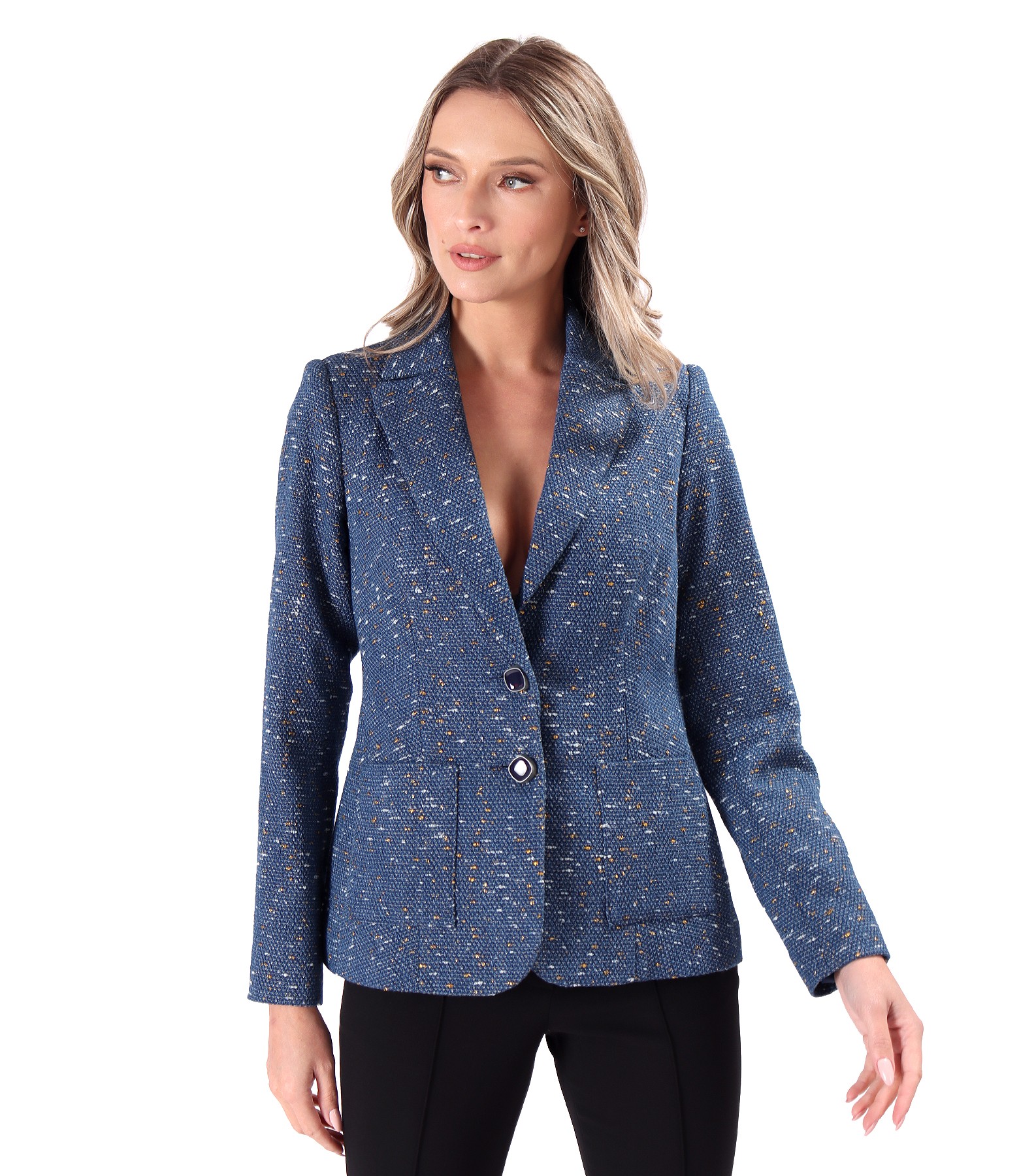 Cotton office jacket, lined, with a deep neckline, patch pockets on the front, and a center-back vent. Fastens with two front buttons.