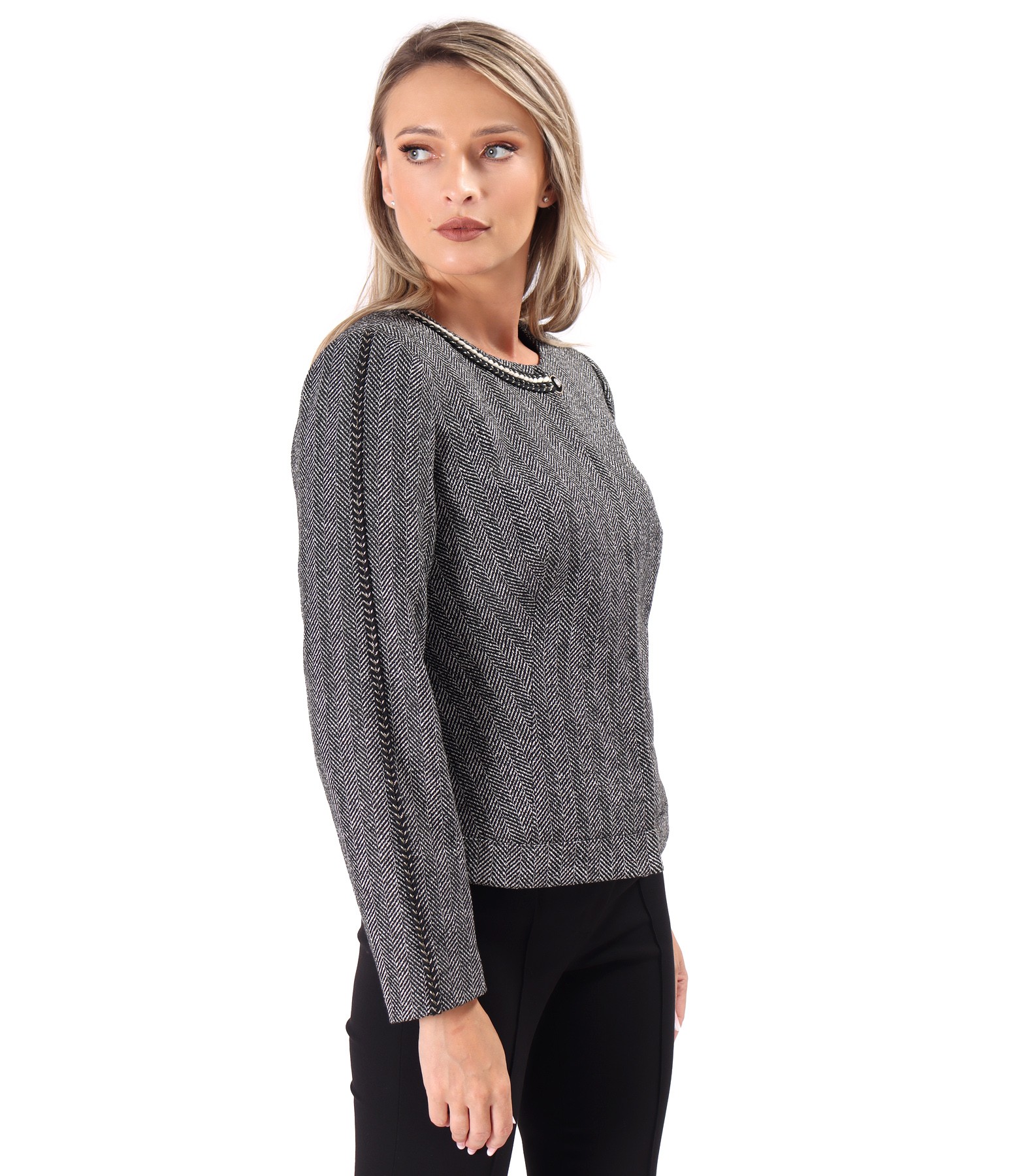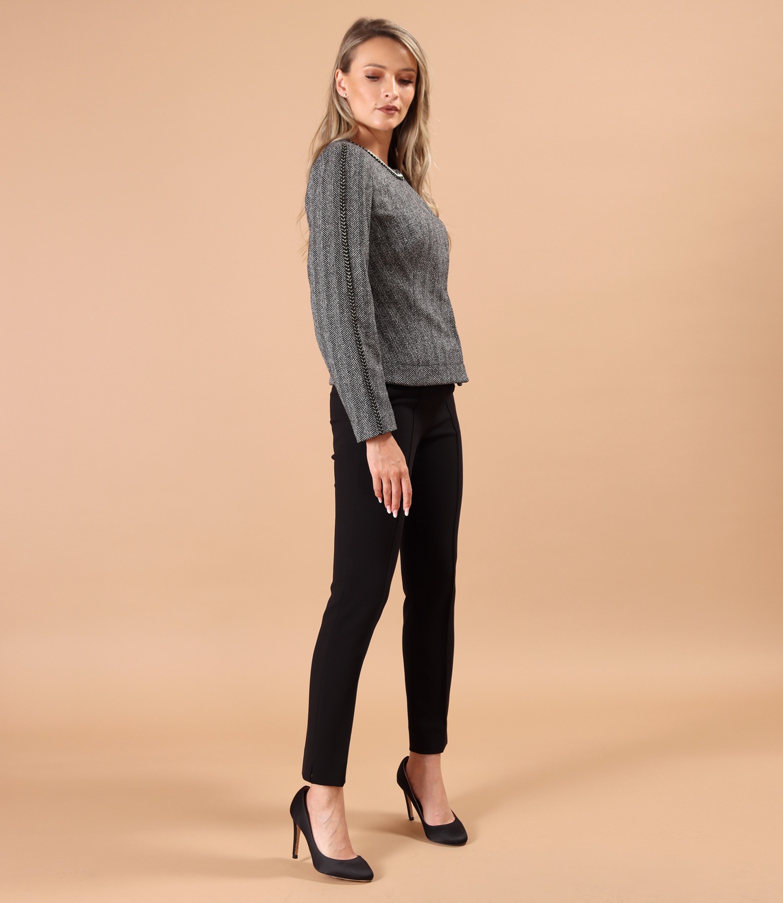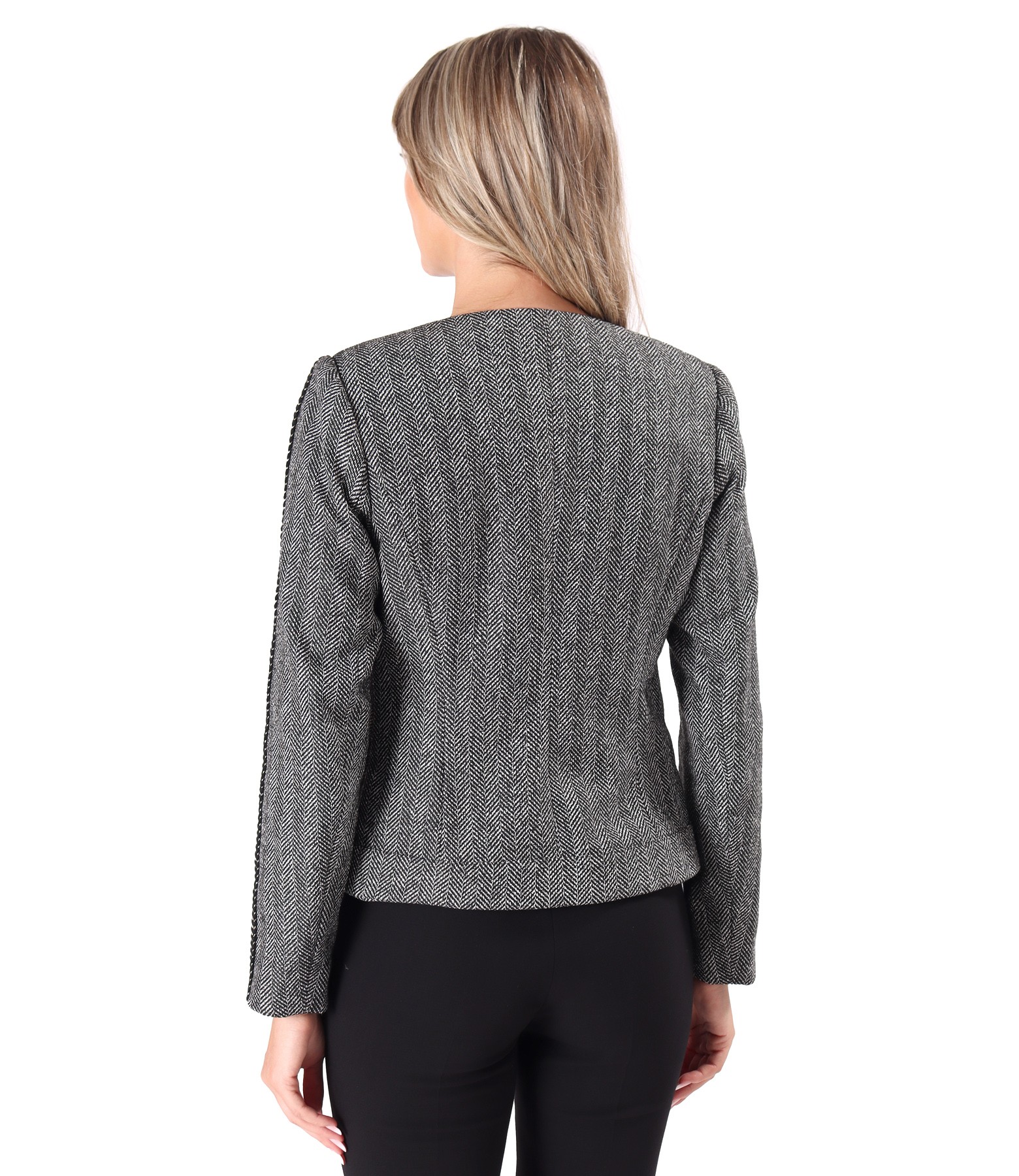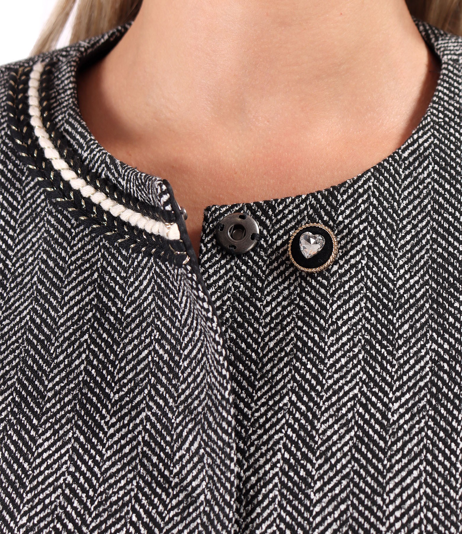 Cotton office jacket, collarless and lined, with a near-neck neckline, decorative button detail, and braid trim at the neckline and sleeves. Fastens with five front snaps.