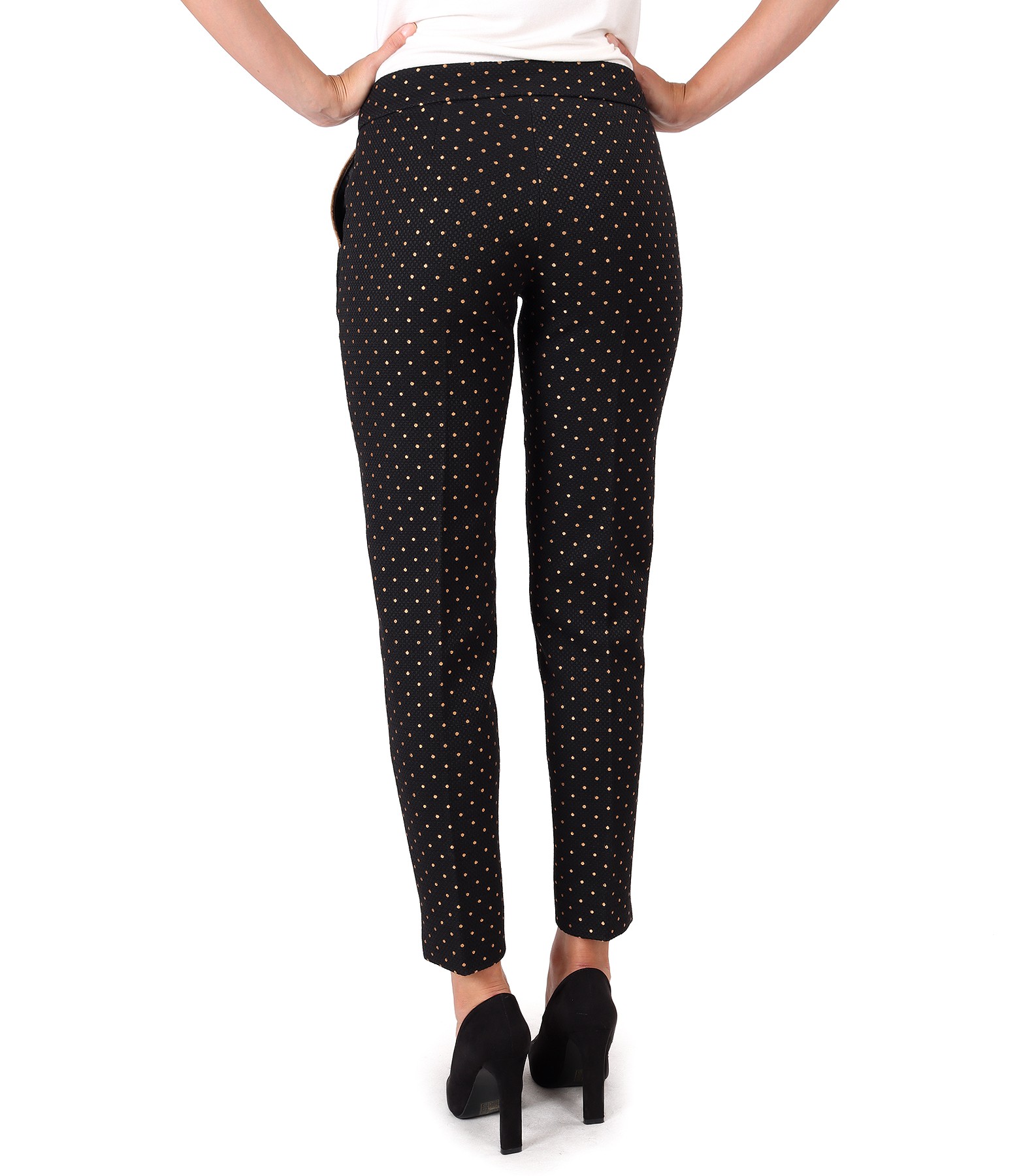 Office pants made of thick brocade cotton, feather shape, ironed at the stripe, with a wide drawstring at the waist and oblique side pockets with velvet insert. They close with a normal zipper, counter-button and 2 staples on the face.