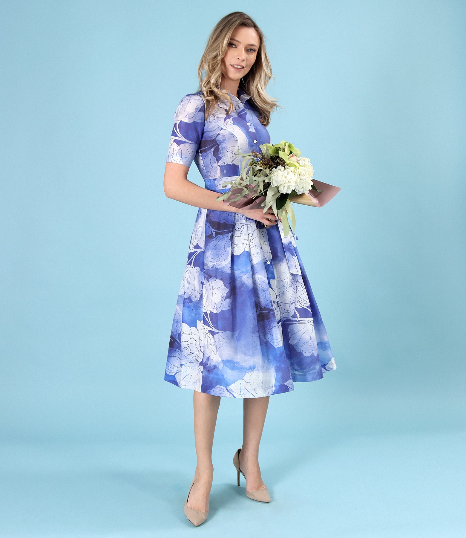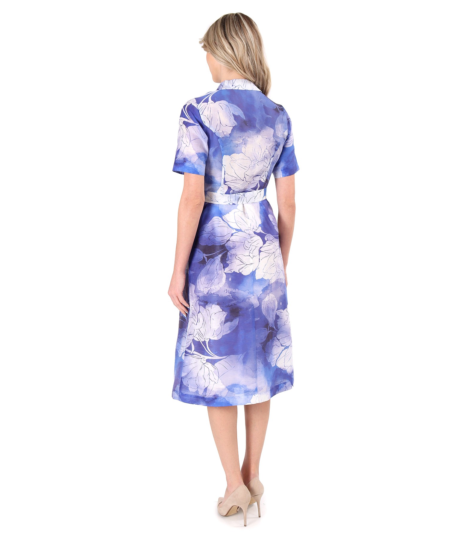Cotton shirt dress with digitally printed linen with floral motifs, padded with viscose only at the bottom, with pleats on the front, short sleeves, drawstring at the waist, and side pockets. It closes with 12 buttons on the middle front.