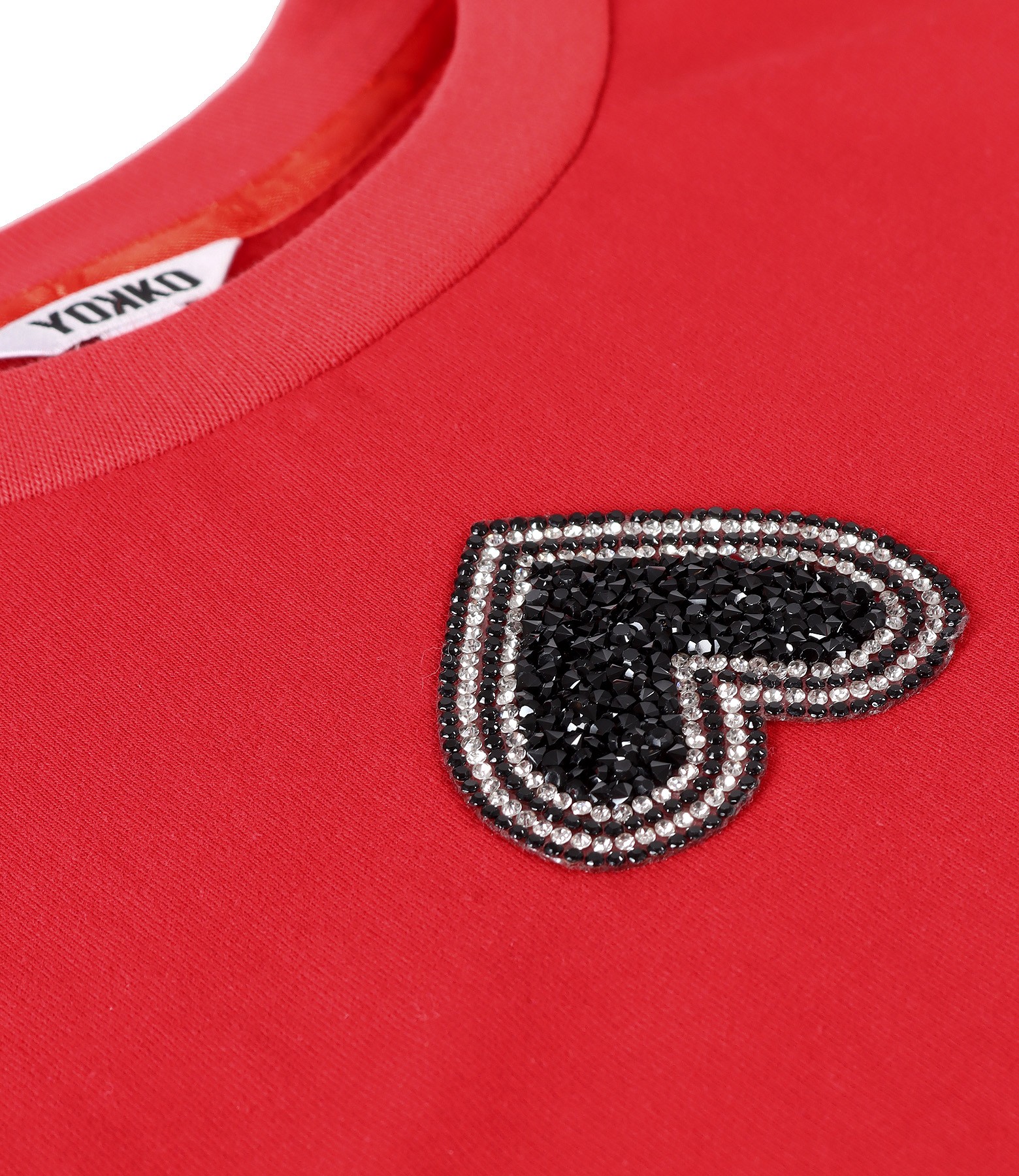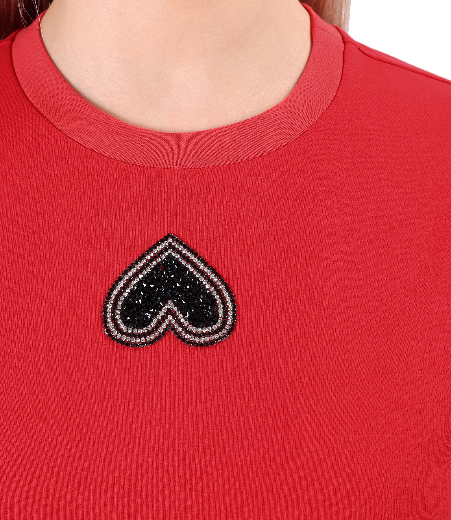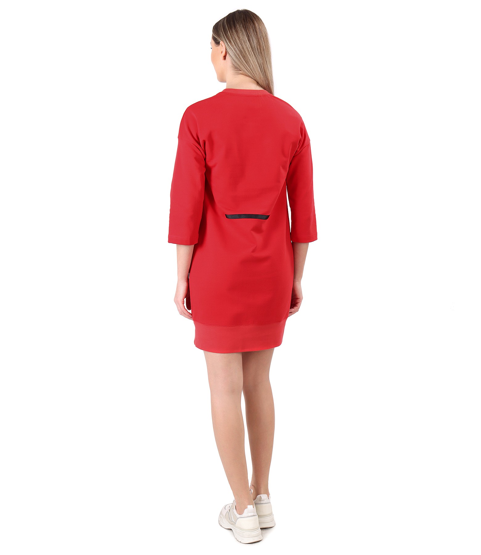 Elastic cotton dress, with front pocket, unlined, with 3/4 sleeves and a round neckline with crystals application.