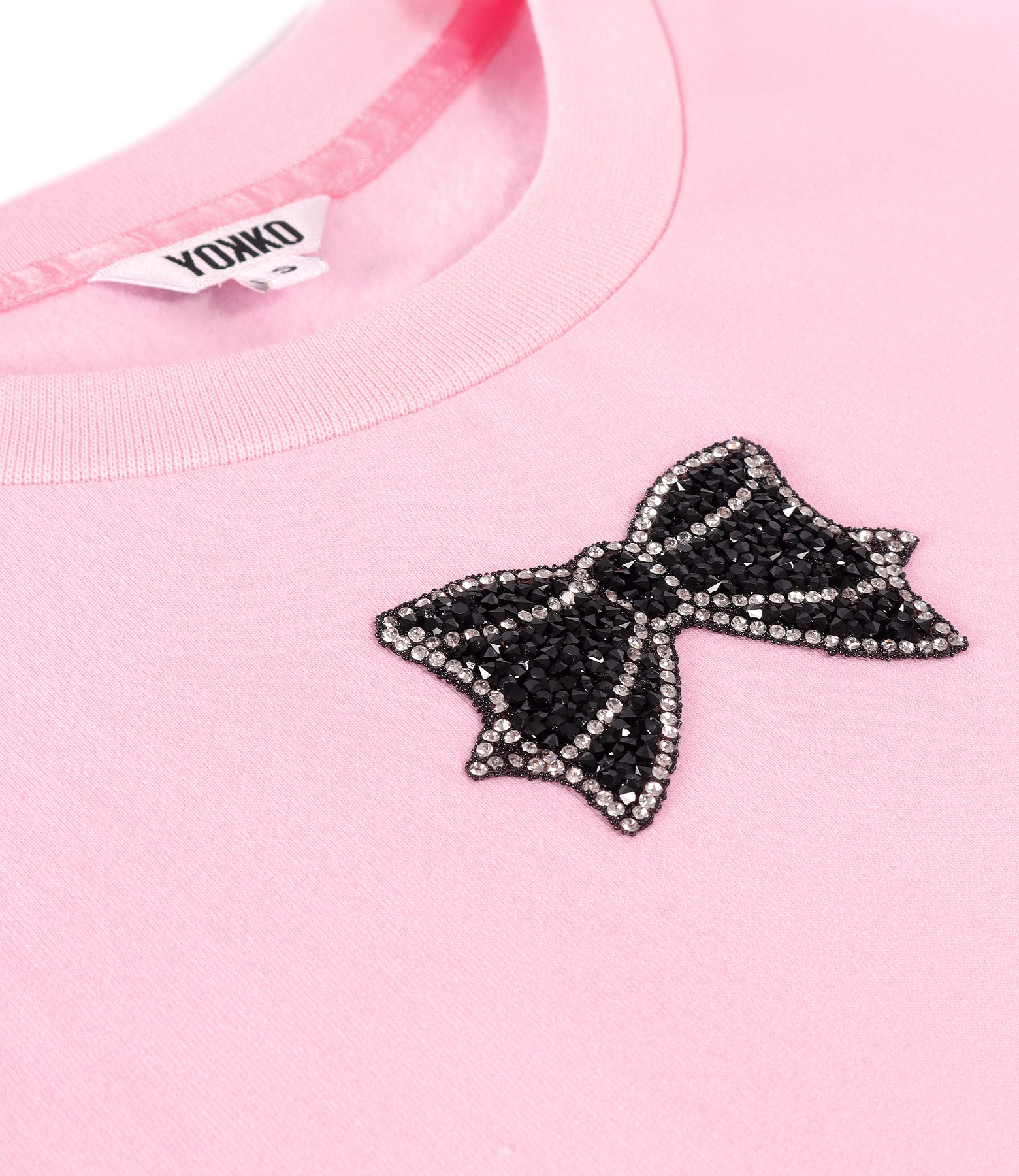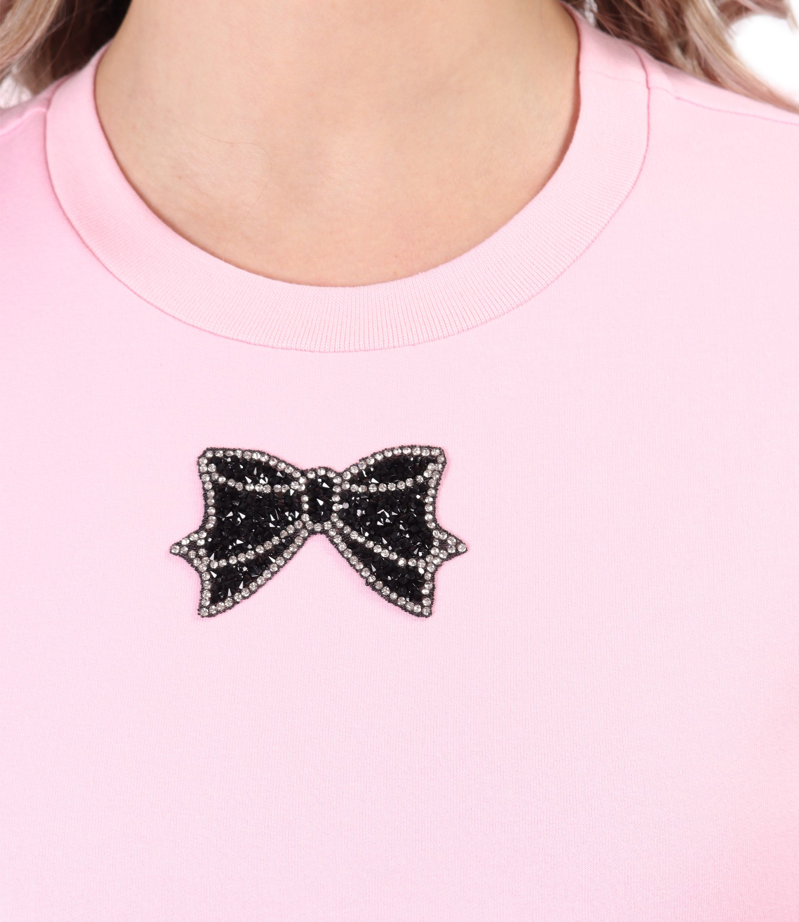 Elastic cotton dress, with front pocket, unlined, with 3/4 sleeves and a round neckline with crystals application.