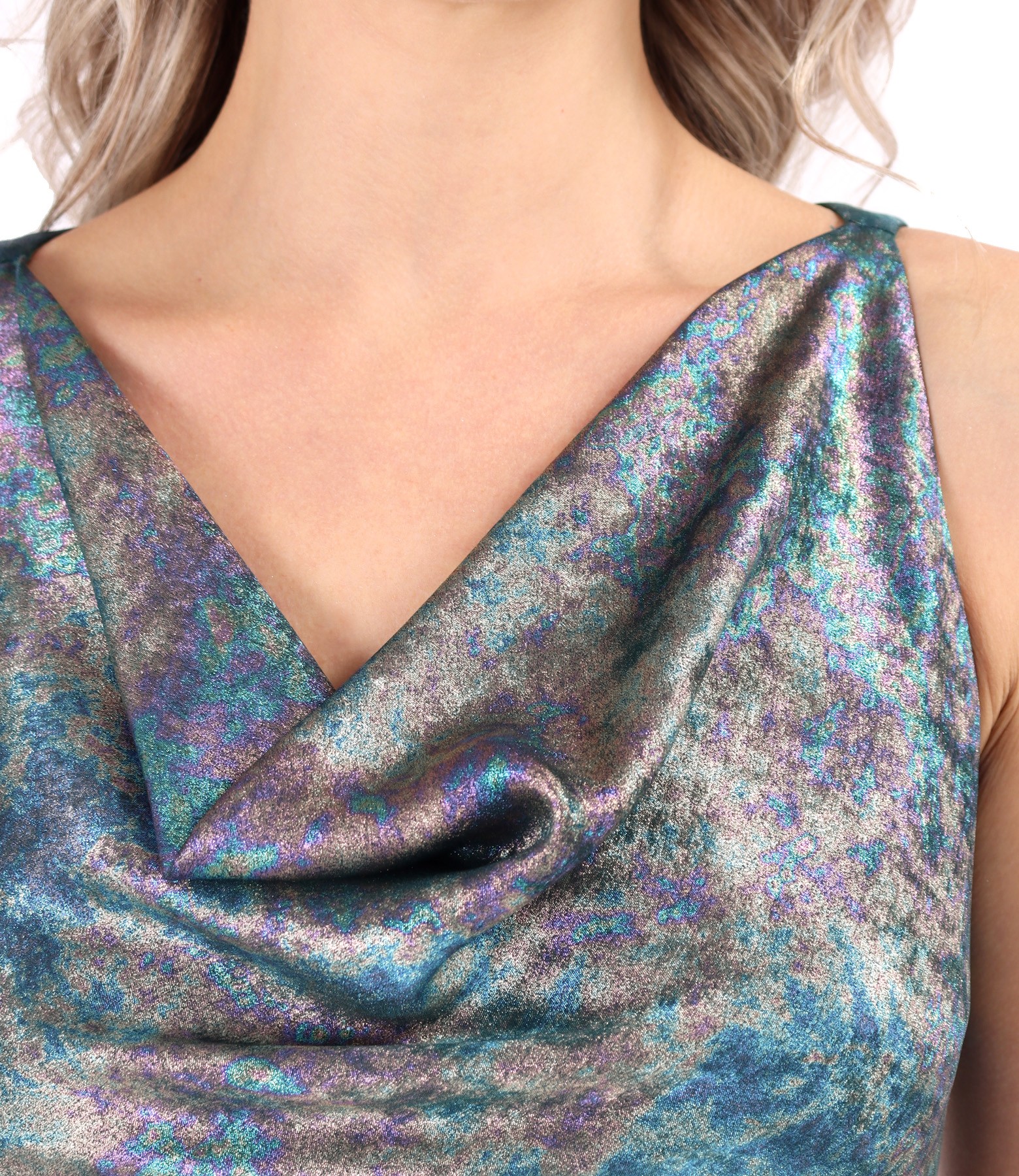 Crepe midi dress with pearlescent effect with pleated neckline, padded with viscose, sleeveless. It has no closure system.